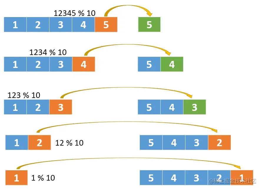 首先我们想一下,怎么去反转一个整数?用栈?或者把整数变成字符串,再去反转这个字符串? 这两种方式是可以,但并不好。实际上我们只要能拿到这个整数的 “末尾数字” 就可以了。 以 12345 为例,先拿到 5,再拿到 4,之后是 3,2,1,我们按这样的顺序就可以反向拼接出一个数字了,也就能达到 “反转” 的效果。 怎么拿末尾数字呢?好办,用取模运算就可以了。