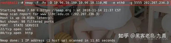 -F参数表示快速扫描100个端口,-Pn不进行ping扫描,-D表示使用ip诱骗方式掩饰真实ip,使用的是10.96.10.100和10.96.10.110,ME表示自己真实的ip,这里是10.96.10.234,-e 参数指定eth0网卡发送数据包,-g参数指定发送的端口号