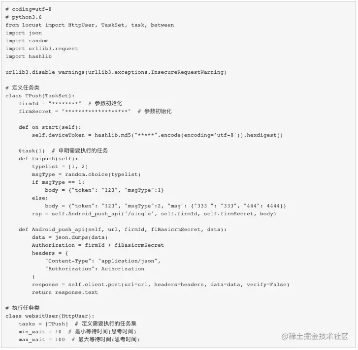 新建一个类TPush(TaskSet),继承TaskSet,该类下面写需要请求的接口以及相关信息; self.client调用get和post方法,和requests一样;
