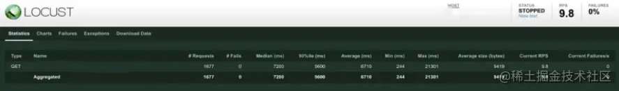 在总用户数为100,每秒增加1个用户的情况下运行一段时间,我们查看locustweb界面: