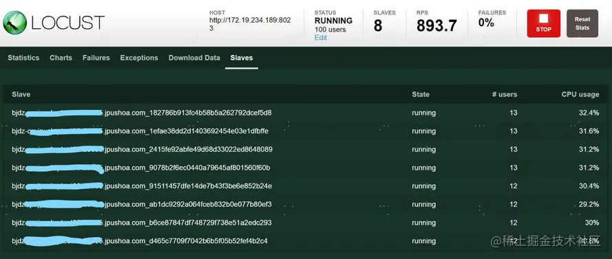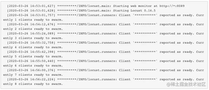 当开启全部slave后,可以查看master的控制台信息,看到下面的信息则表示locust分布式部署成功了