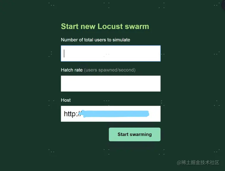 启动压测前,需要填写用户总数(Number of total users to simulate)、每秒增加的用户数(Spawn rate)以及域名(HOST)。