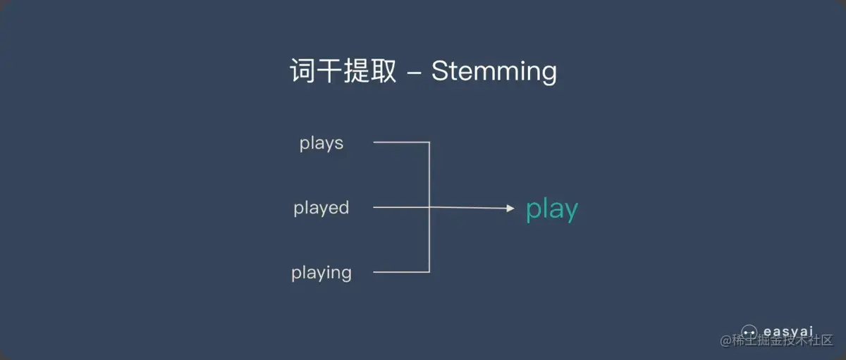 比如当我搜索「play basketball」时,Bob is playing basketball 也符合我的要求,,但是 play 和 playing 对于计算机来说是 2 种完全不同的东西,所以我们需要将 playing 转换成 play。