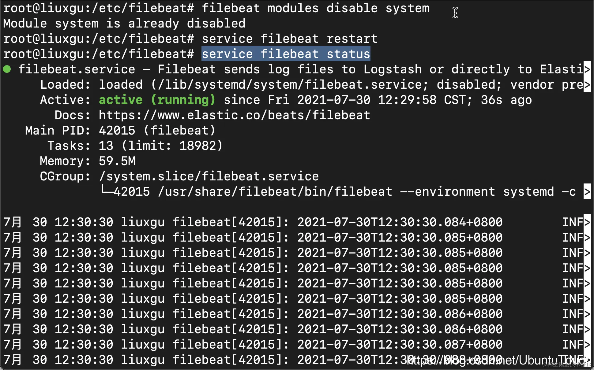 在修改完 filebeat.yml 文件后,我们重新启动该服务: