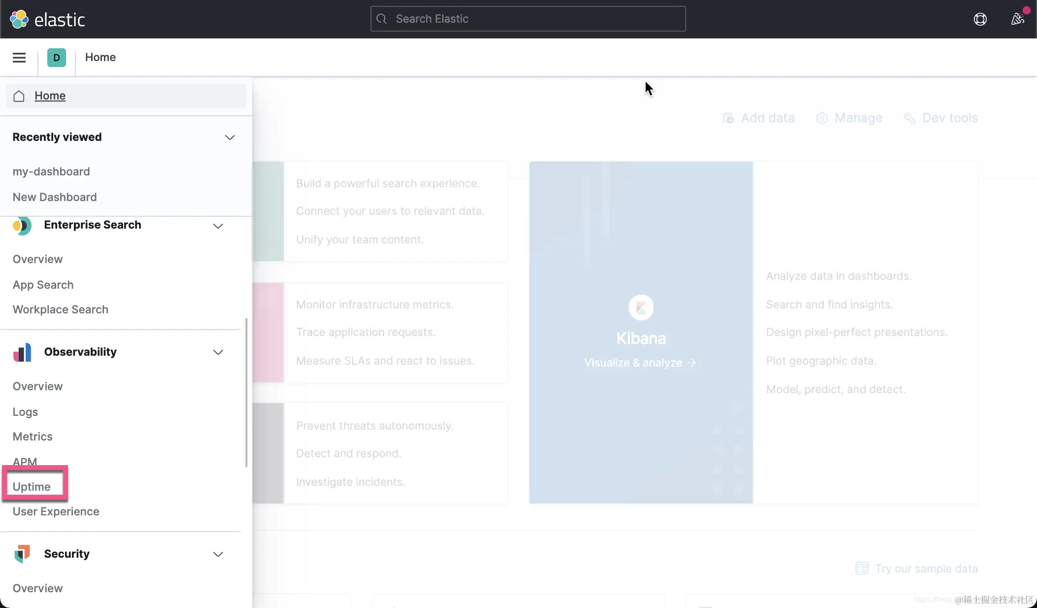 这样我们就可以看到数据被导入到 Elasticsearch 中。我们打开 Kibana 中的 Uptime 应用: