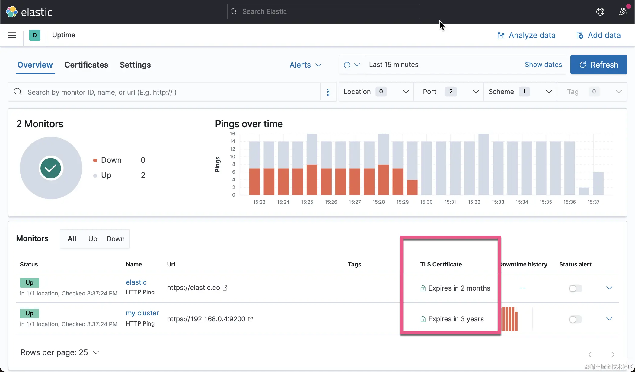 在上面,我们可以清楚地看到 elastic.co 网站的 TLS 将在 2 个月后就会过期,而我自己的 Elasticsearch 集群的证书将会在 3 年后过期。
