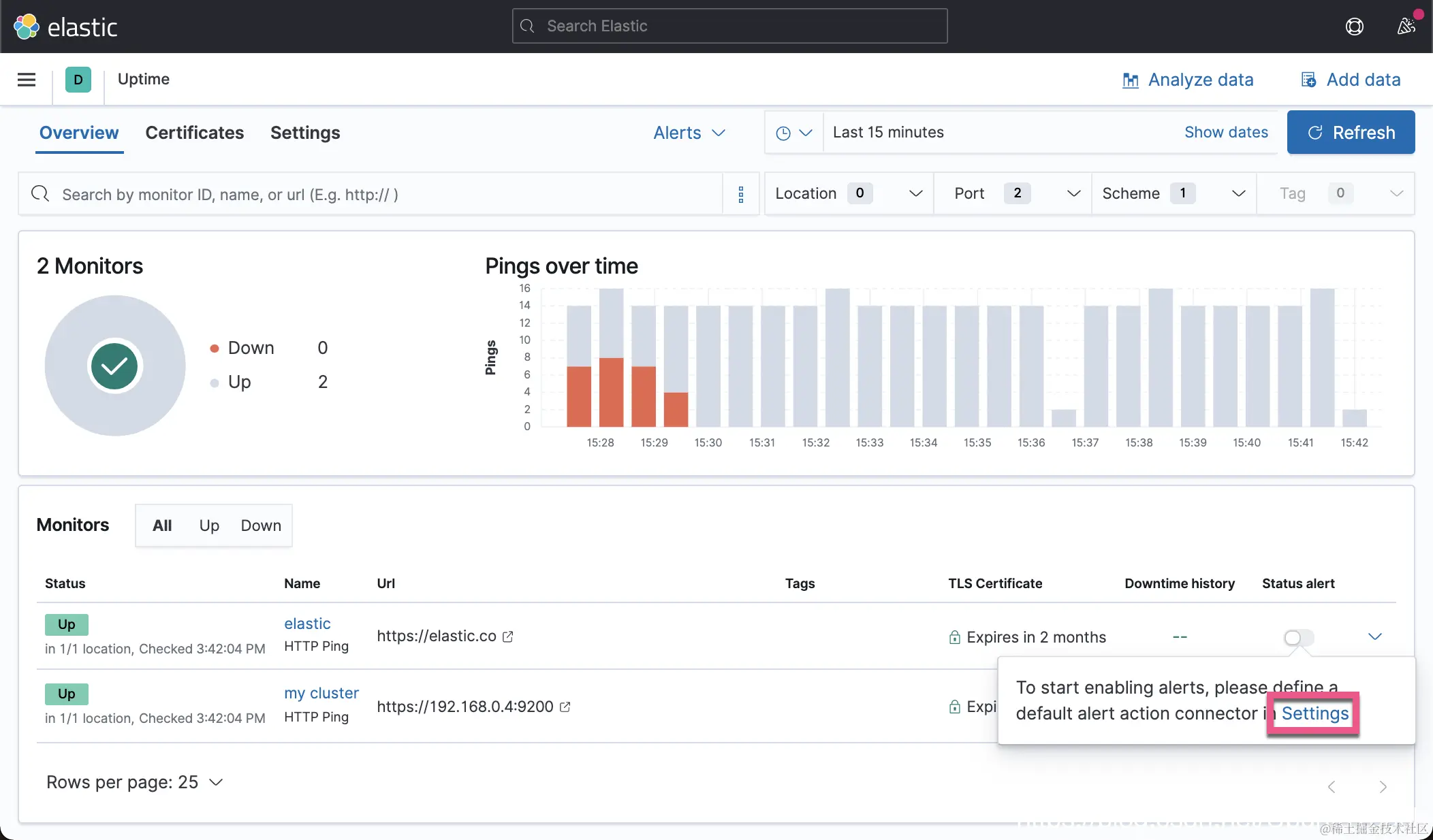 在上面,我们使用两个 http 的监控。一个监控 Elastic 的官方网站 elastic.co,而另外一个是我的自己的 Elasticsearch 集群。