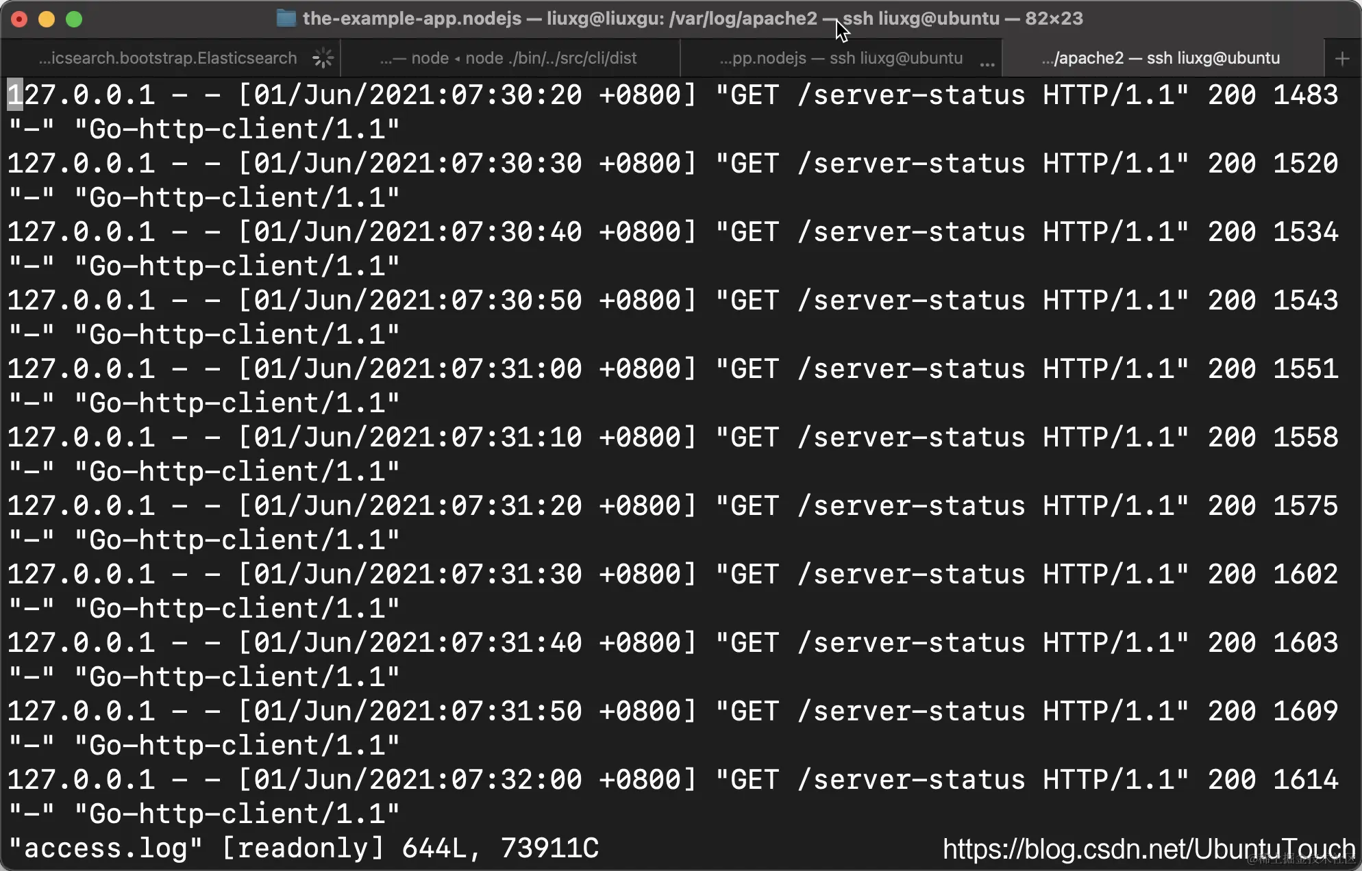 从上面的输出中,我们可以看到这里的日志就是我们在 /var/log/apache2/access.log 里的内容。