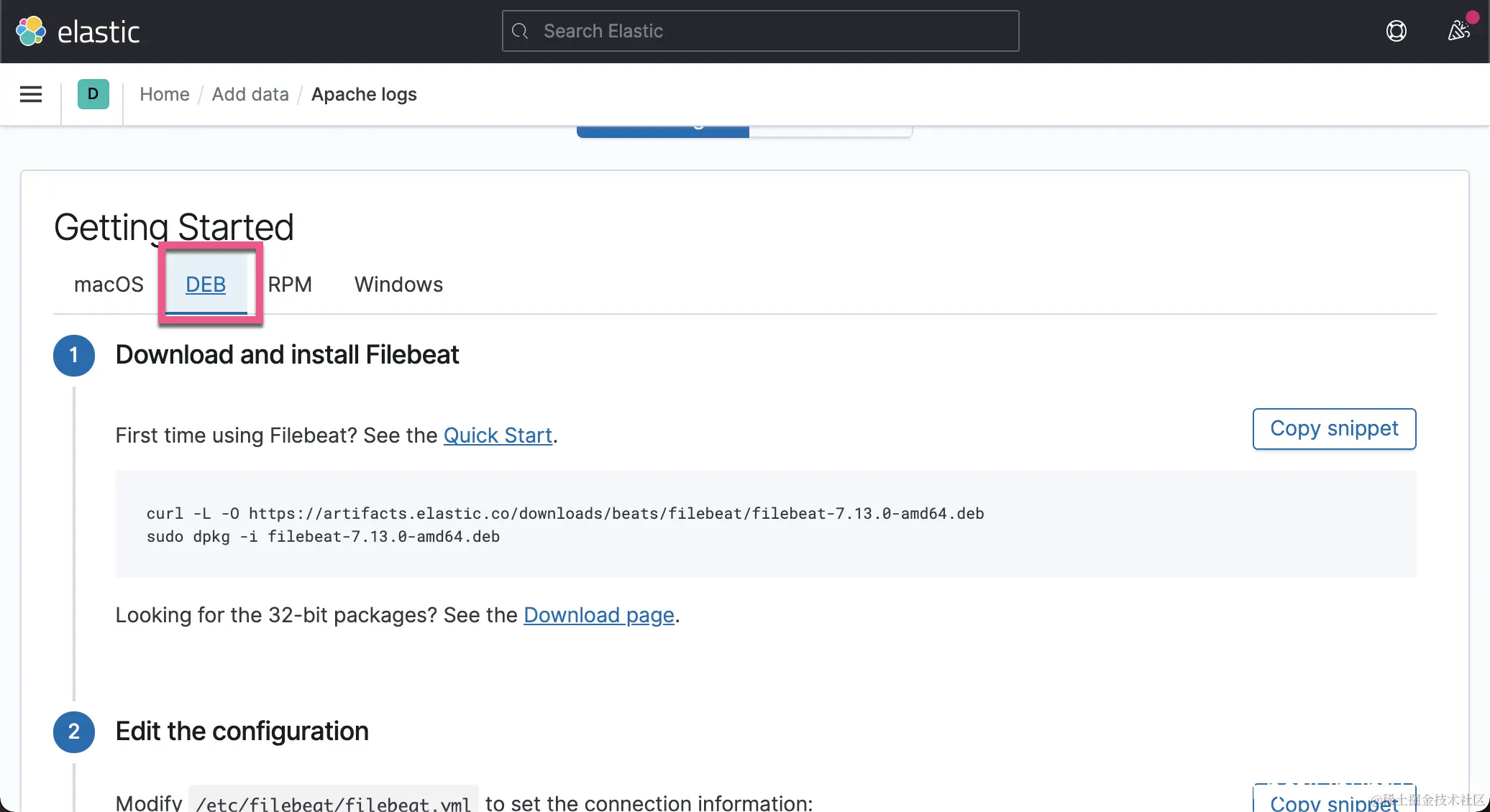 我们接下来按照 Kibana 给出的指南来安装 Filebeat。在我们的练习中,我们将使用 Apache server 来生产 log,并使用 Filebeat 来收集这些 Log。