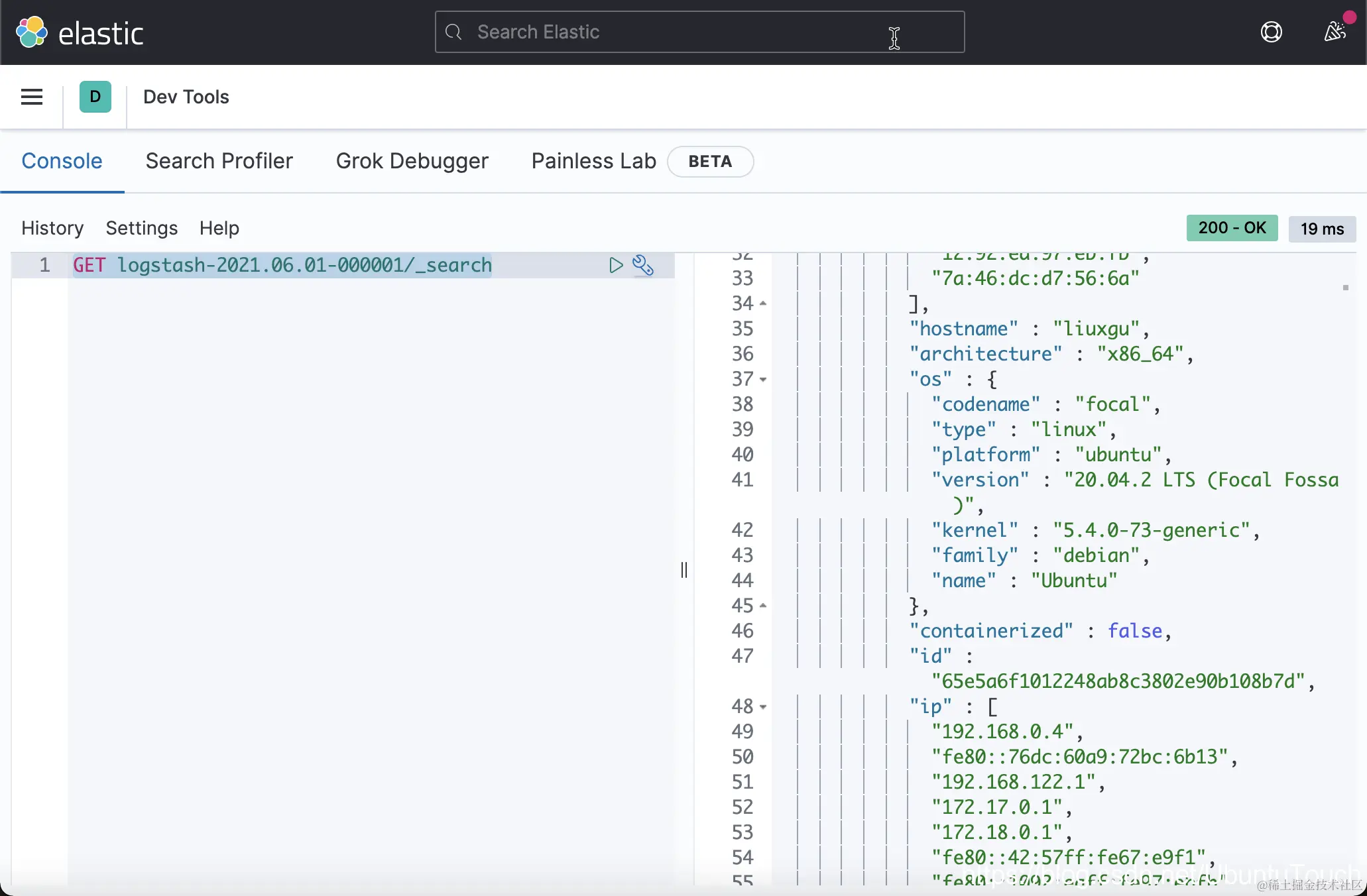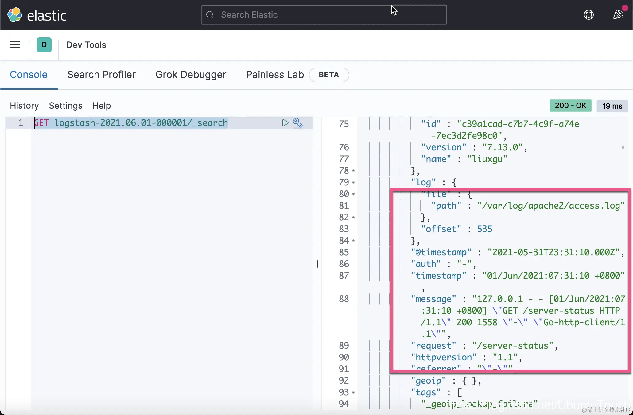 从上面,我们可以看出来一个最新的 logstash-2021.06.01-000001 索引。我们可以通过如下的命令来查看它里面的文档: