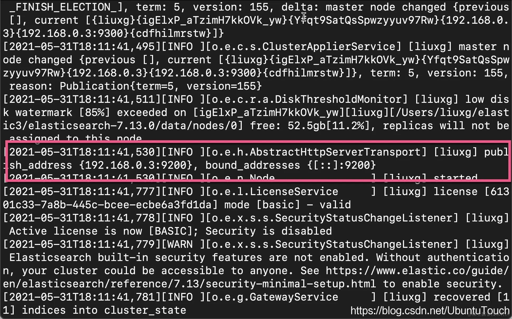 在这里,我们配置 network.host 为 0.0.0.0 是为了能够使得我们部署在 MacOS 上的 Elasticsearch 可以被 Ubuntu OS 上的 Logstash 及 Filebeat 进行访问。这样的设置可以使我们的 Elasticsearch 可以绑定所有的网络接口。完成 elasticsearch.yml 的配置后,我们重新启动 Elasticsearch。我们可以看到: