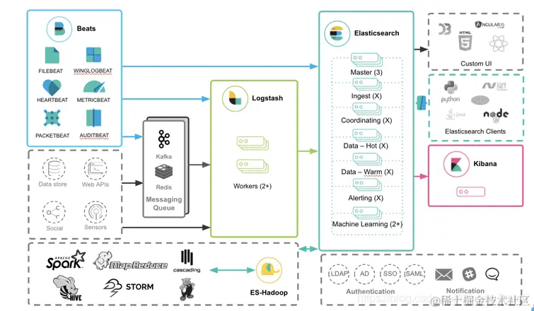 在 Elastic Stack 的架构中,我们通常使用如下的一个图来表示: