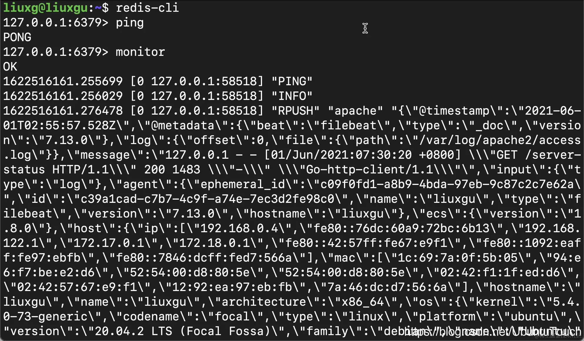在我们这样做之前,在我们的第二个终端中,让我们访问 Redis-CLI 监控模式,以便能够看到发生的所有 Redis 操作。 只需输入以下命令即可完成此操作: