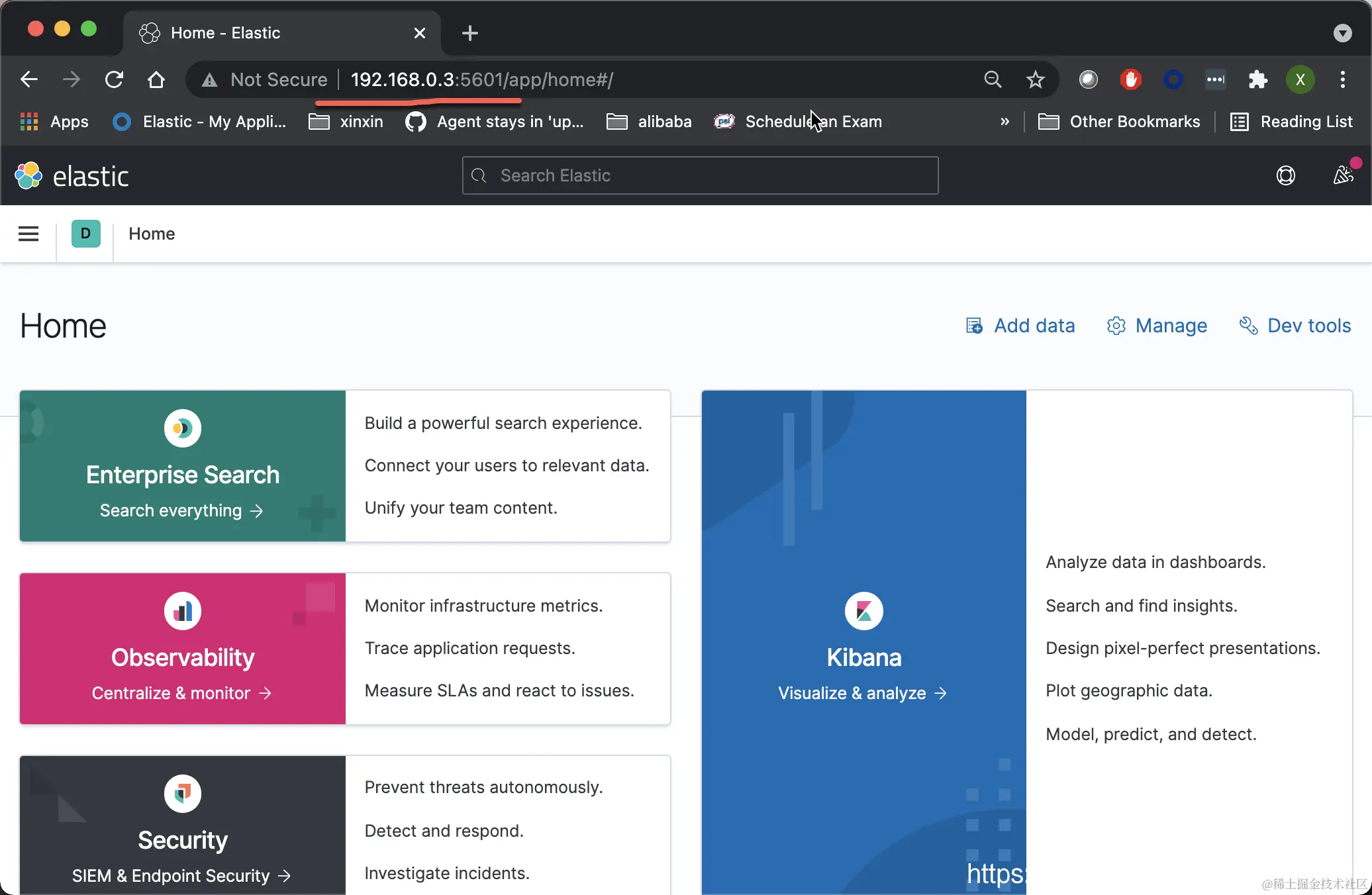 请注意在上面,我设置了本地 IP 地址为 Kibana 的服务器地址。你需要按照自己的 IP 地址进行修改。这是因为我们可以使得 Filebeat 可以访问 Kibana 来进行 setup (生成相应的 Dashboard 等,详细阅读,请参阅 “Beats 入门教程 (二)”)。等配置完 kibana.yml 文件后,我们重新启动 Kibana。在我们的浏览器中,我们输入相应的 IP:5601 来查看安装是否正确: