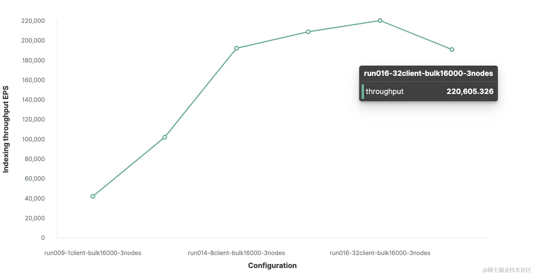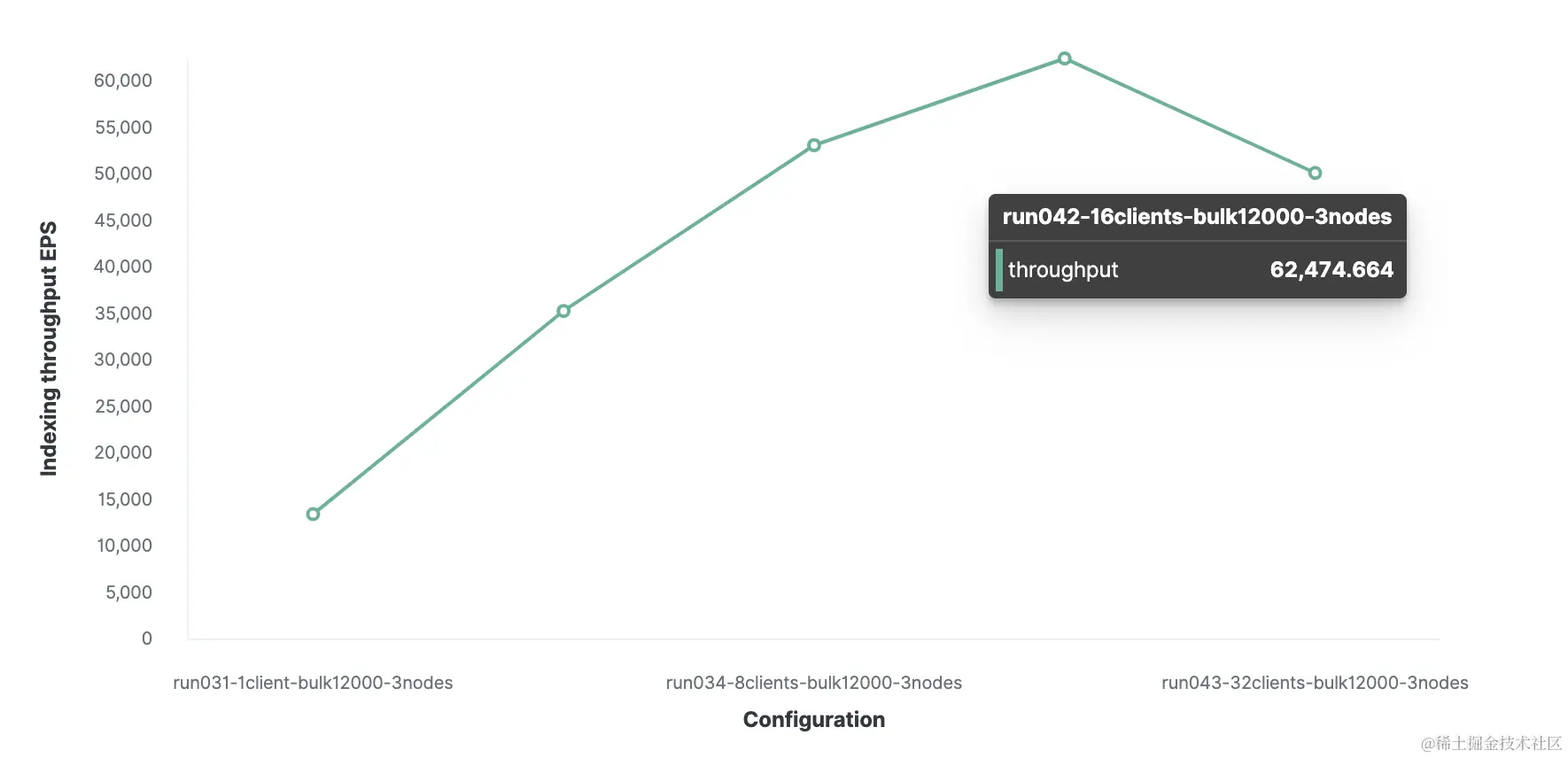 接下来,使用类似方法,我们发现客户端的最优数量是 16 个,使我们可以达到每秒索引 62,000 个事件。