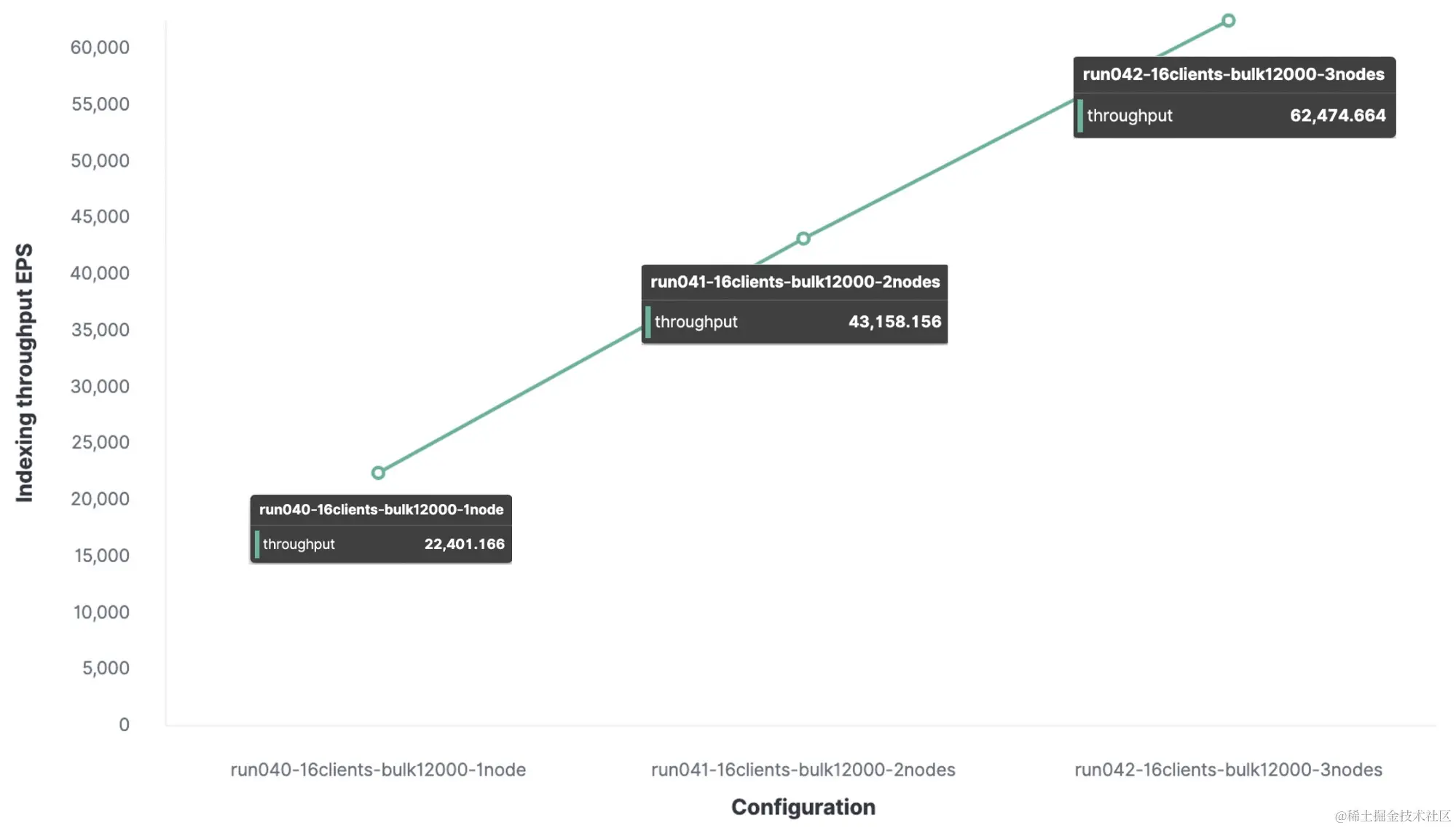 - 使用 3 个节点和 3 个分片,我们每秒得到 ****62,000 个事件。