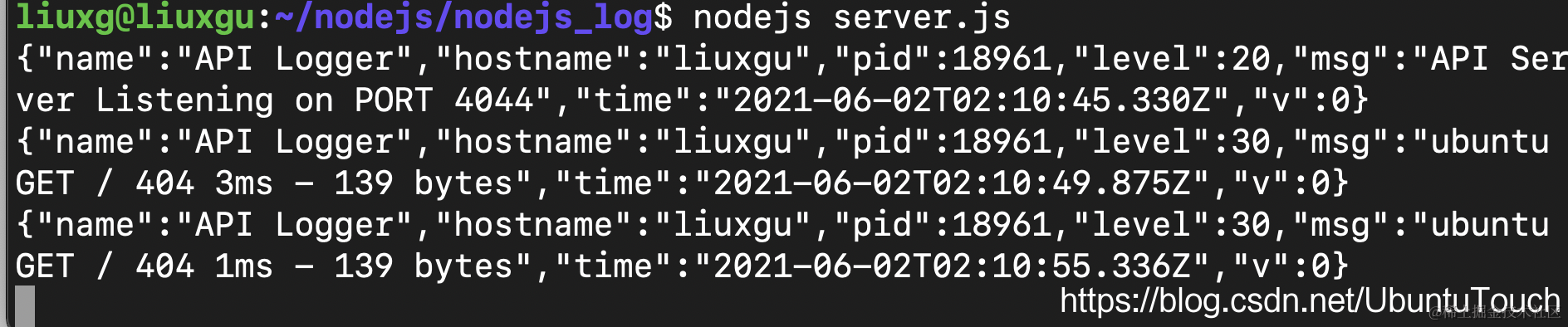 {"name":"API Logger","hostname":"liuxgu","pid":155774,"level":20,"msg":"API Server Listening on PORT 4044","time":"2021-06-01T12:04:04.926Z","v":0}