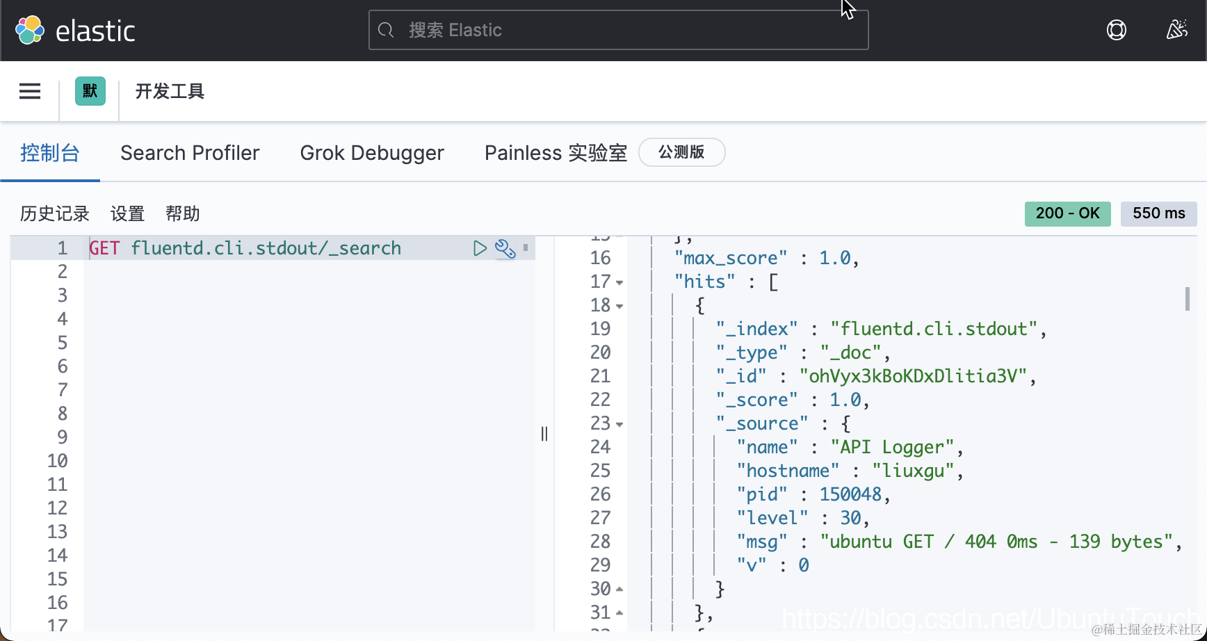 在上面,我们可以看到一个叫做 fluentd.cli.stdout 的索引。我们可以通过如下的命令来查询该索引: