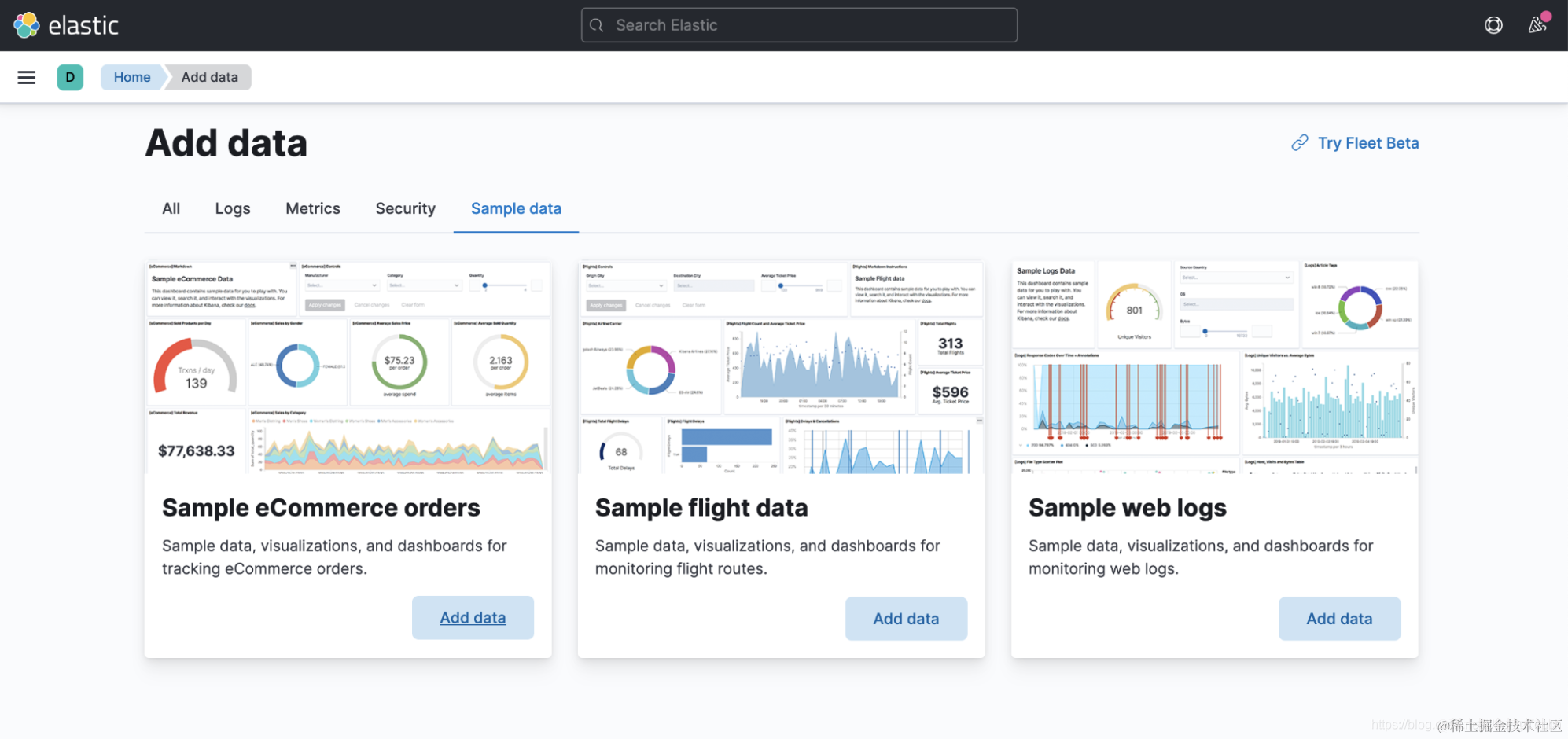 进入 Kibana 后,你可以通过单击 “Add data” 按钮从 “Sample data” 目录中获取数据集。