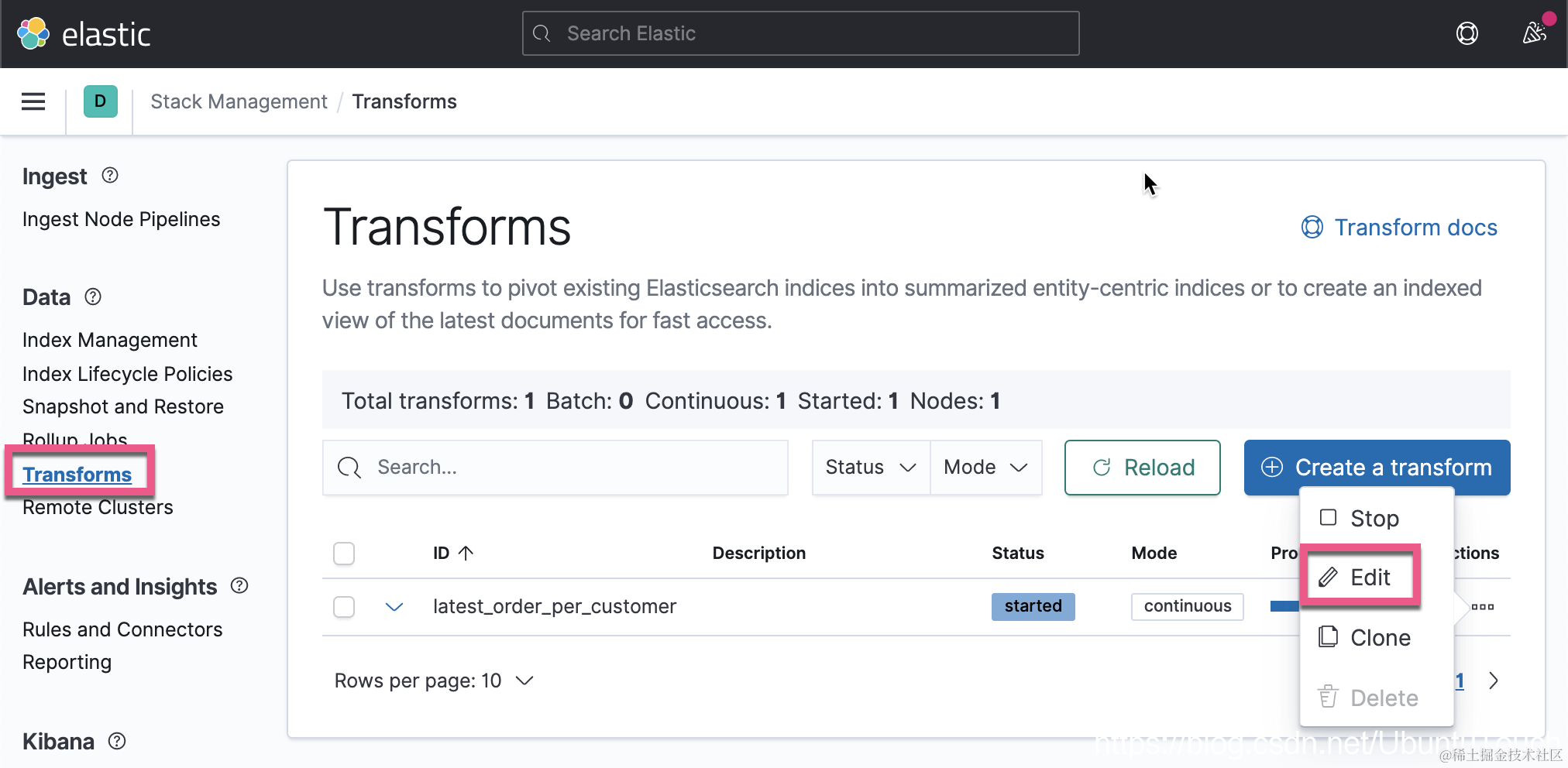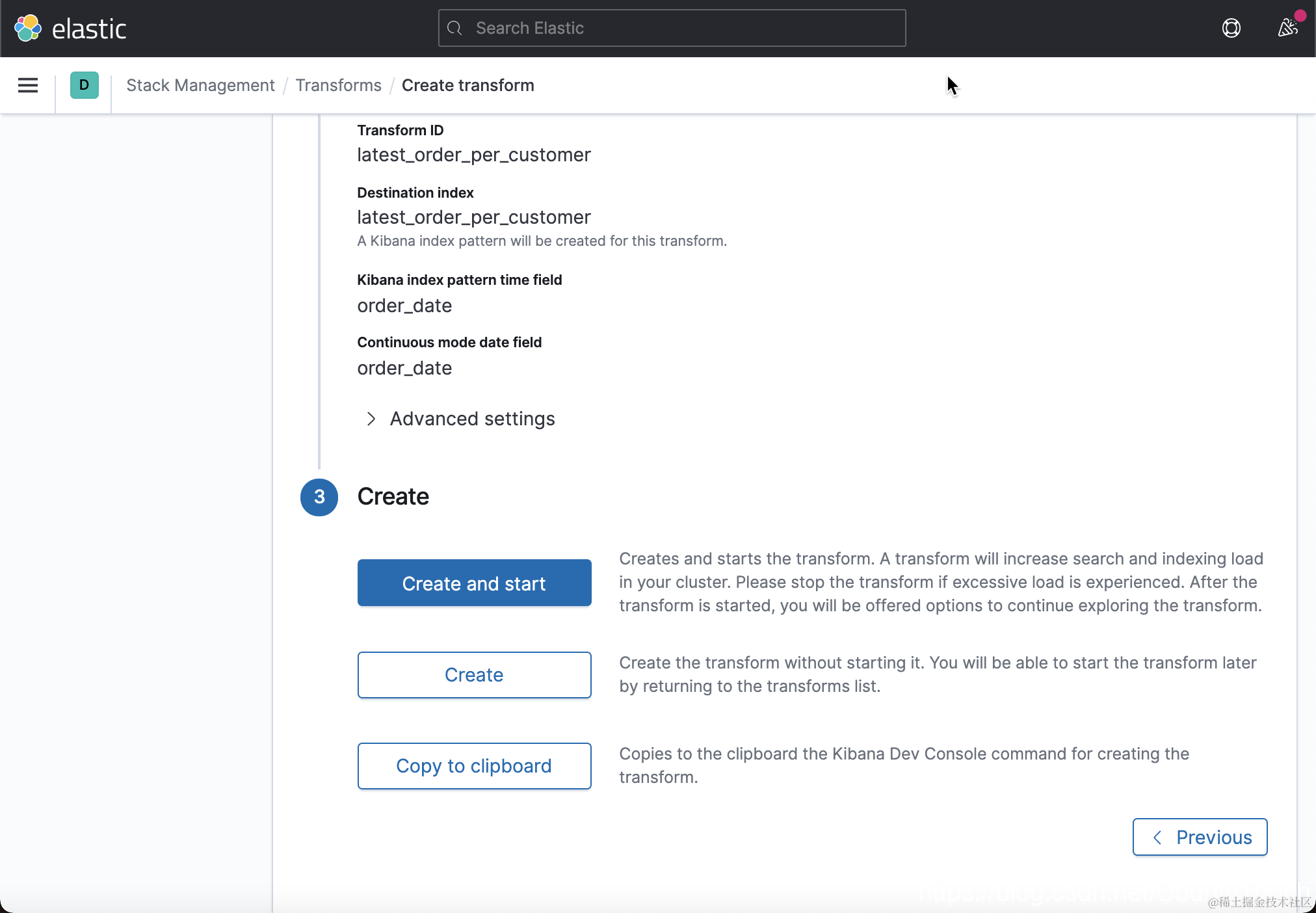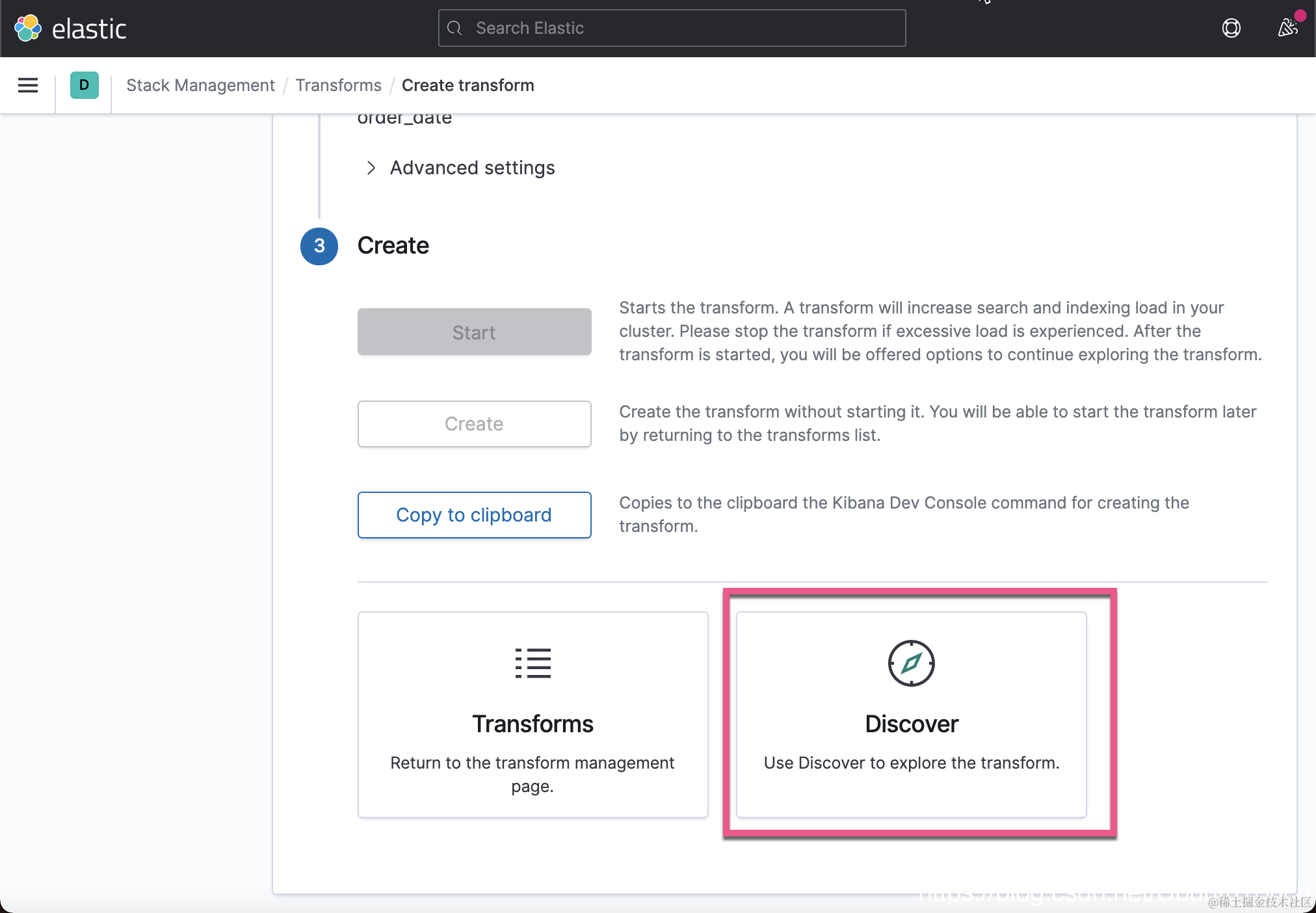 转到 Stack Management > Transforms,然后选择 Create transform 页面上的最新按钮: