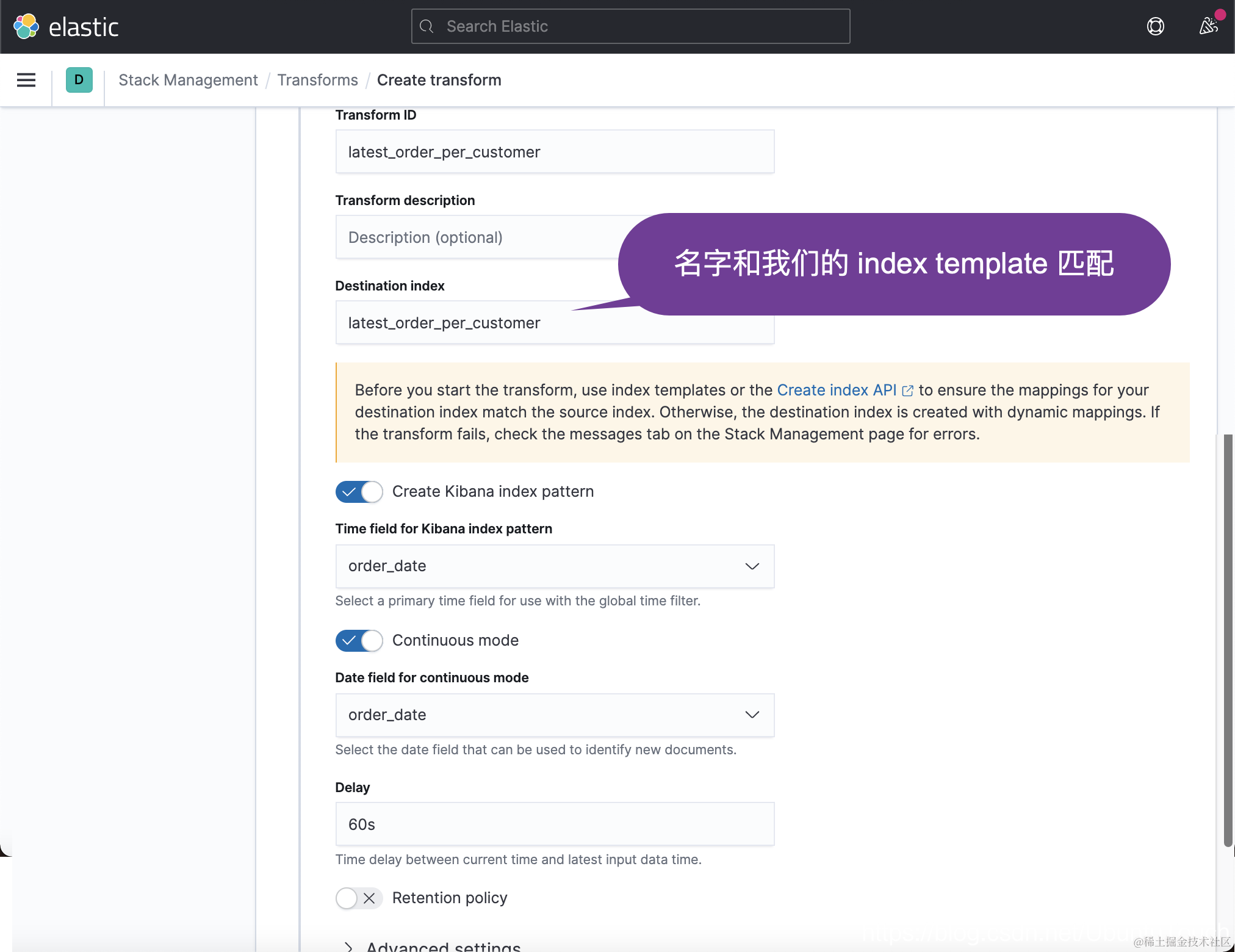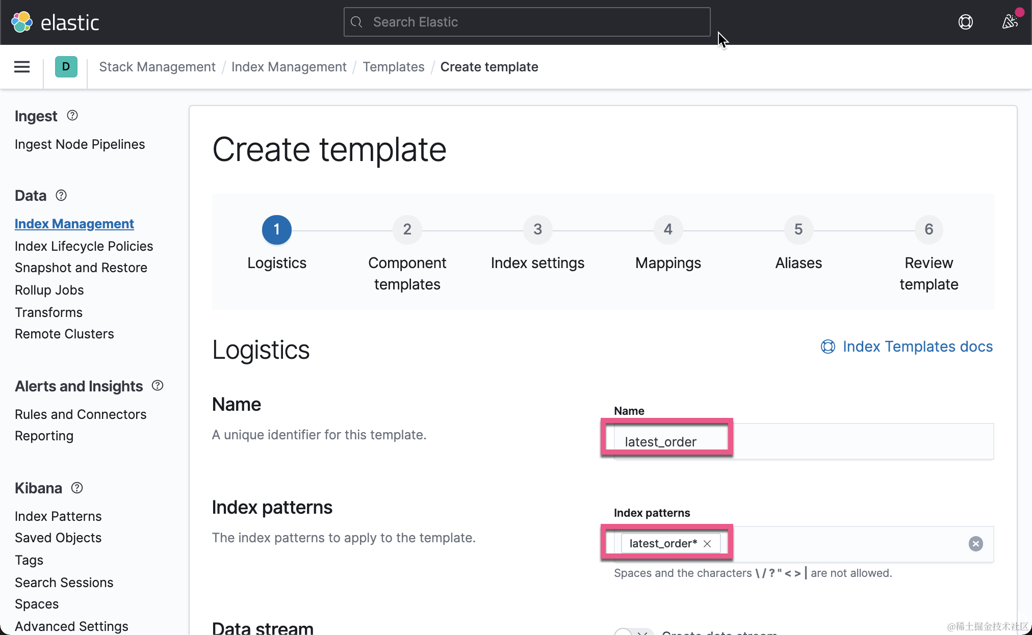 2)在 Create Template 页面中创建一个新的索引模板,并将其模式设置为 latest_order* 以匹配你稍后将在转换配置中指定的目标索引的名称。