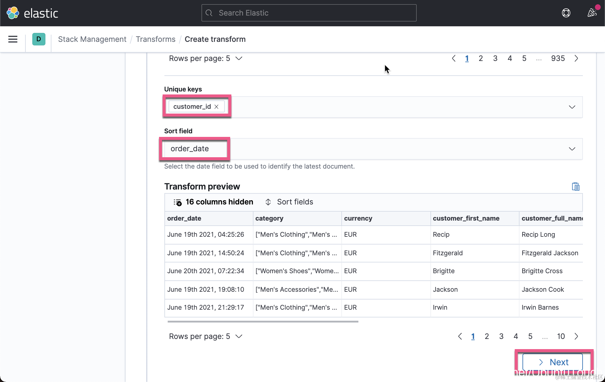 2)在屏幕下面的 transform 配置里,将 Unique keys 选项配置为具有 customer_id 的值并将 Sort 字段设置为 order_date: