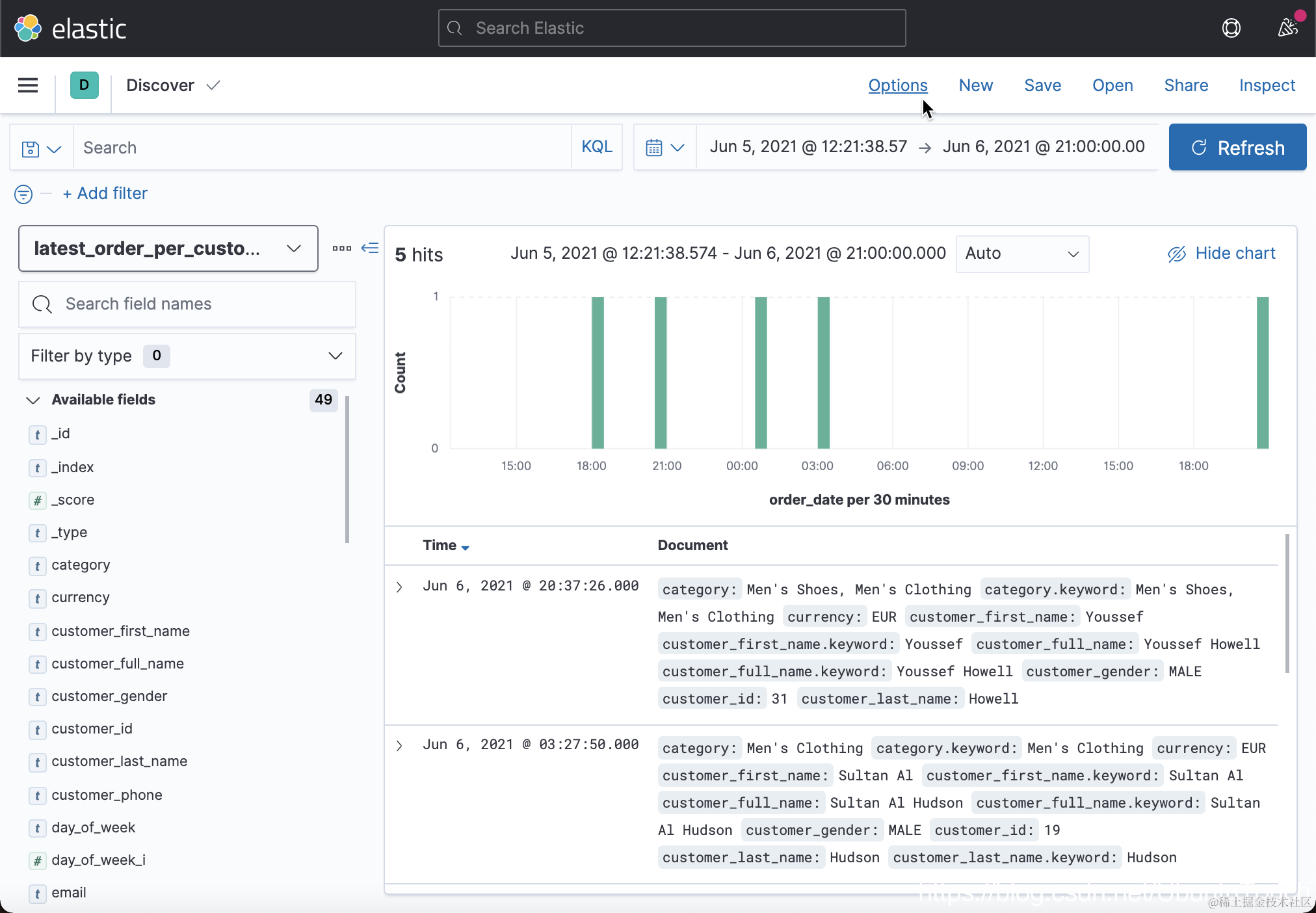 我们将 kibana_sample_data_ecommerce 索引转换为一个新索引(我们称之为 latest_order_per_customer),其中仅包含每个客户的最新订单。