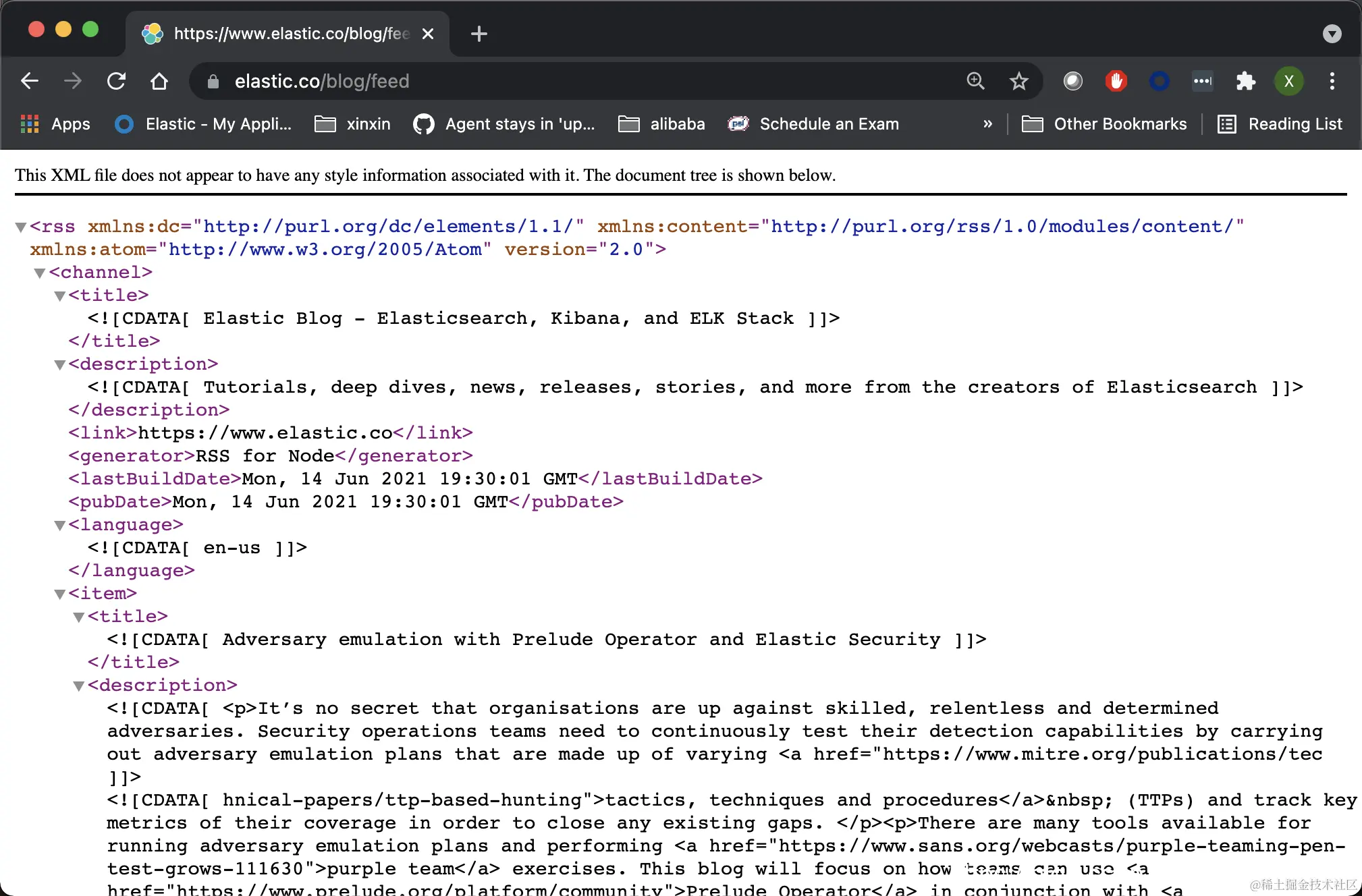 在上面,我们可以看到 RSS 的响应结果。它里面含有 title, description 等信息。这些我们可以使用 RSS input plugin 来进行提取。