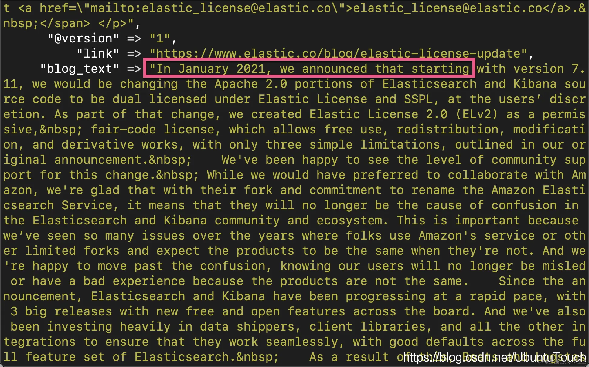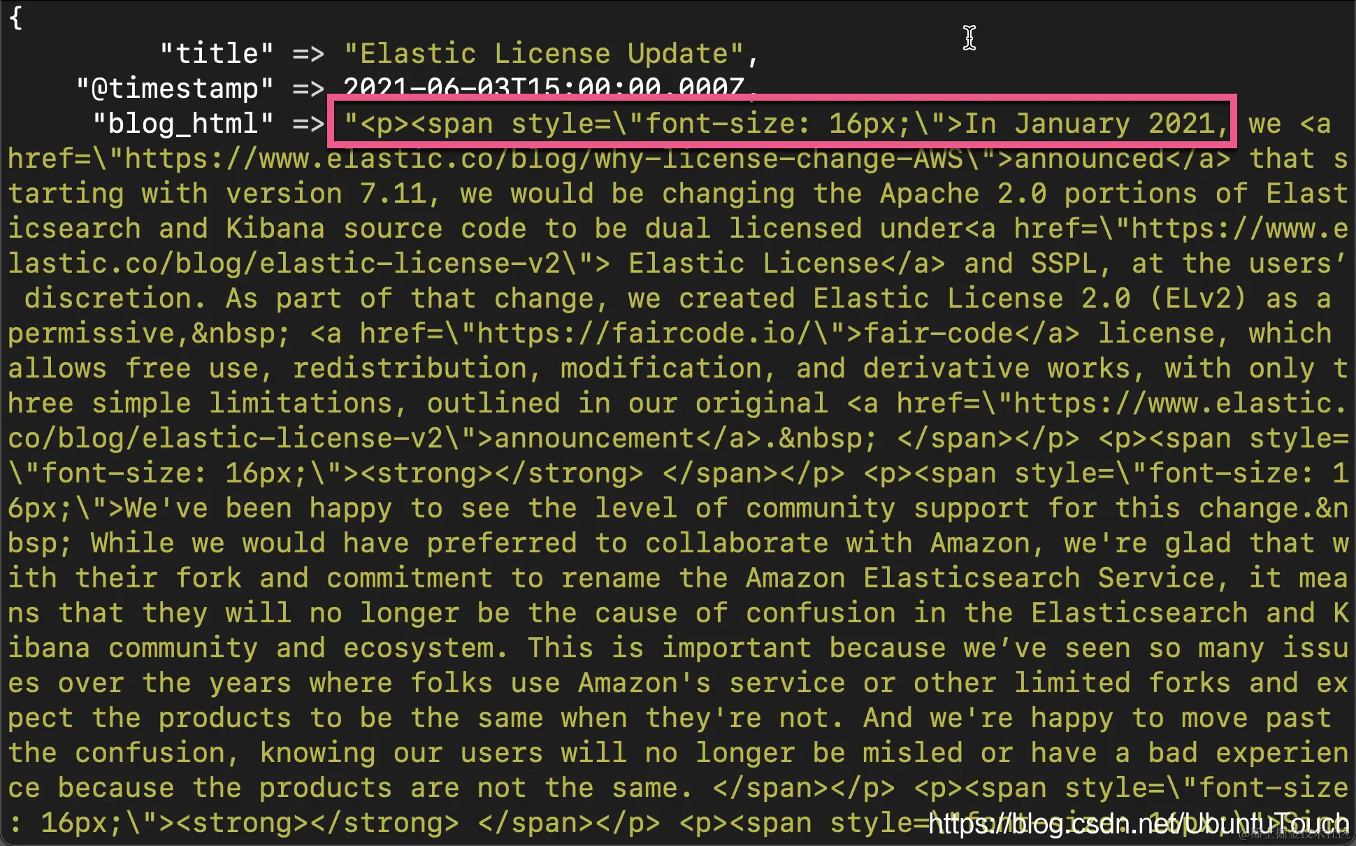 在上面的 input 部分,我们定义了 rss。它的 url 是 www.elastic.co/blog/feed。interval 为 120,也就是 120 秒。每隔两分钟运行一次。同时我们添加了一下我们想要的 tags 便于我们的数据搜索。在 filter 部分,我们把 message 重新命名为 blog_html,并同时对字段进行了复制。在 mutate 的部分,我们把所有的 <> 括号里的内容都置换为“”,也就是去掉。同时,也置换 \n\t 这样的字符为空 “ ”。最后,我们删除 published 及 author 字段尽管删除 author 字段是不必要的。