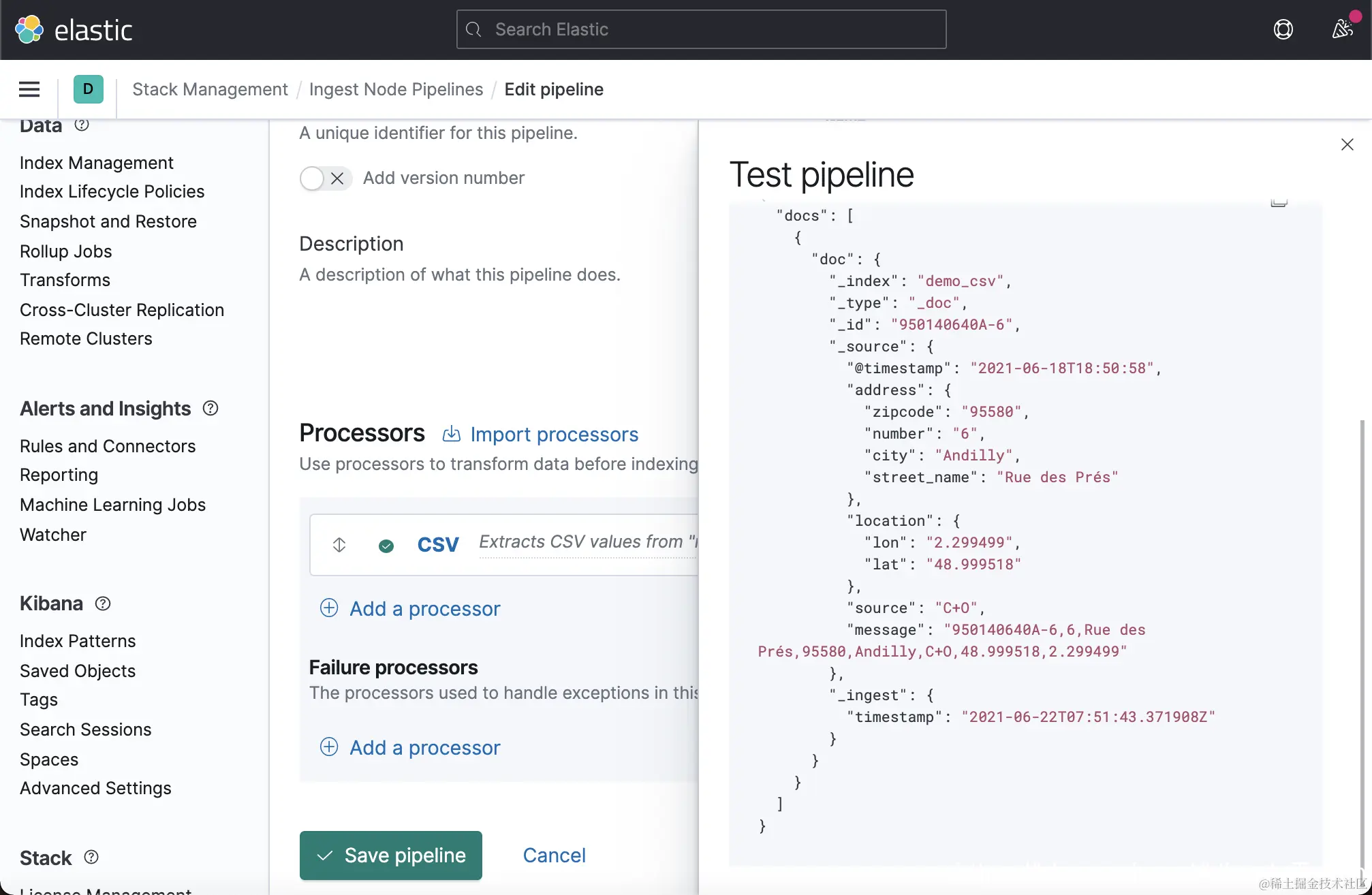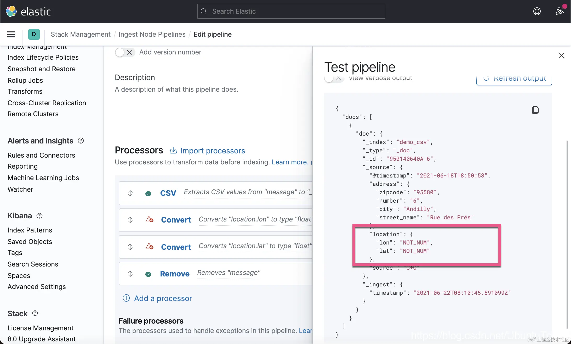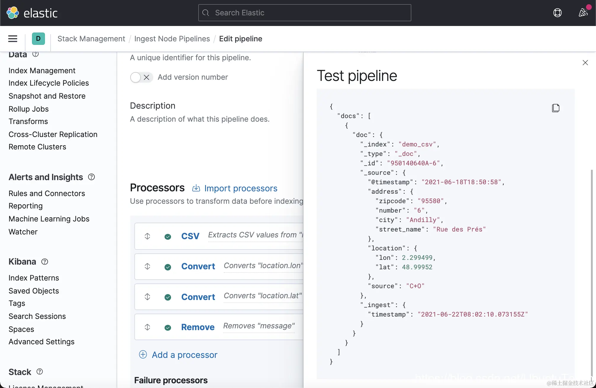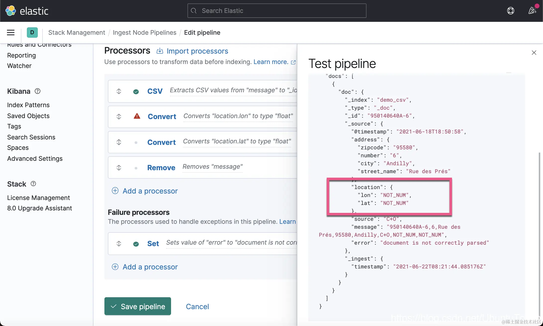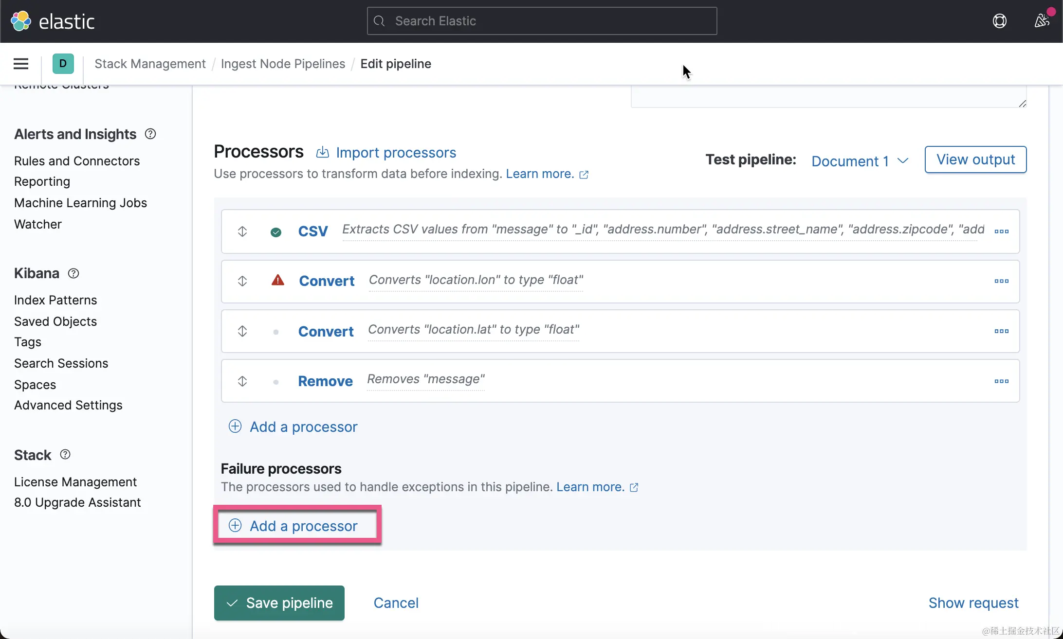 这一次,我们没有看到像上次的那种错误了,但是 location 里的内容还是不正确。一种解决办法就是删除这个 location 字段。在上面的 Failure processors 中,我们再添加一个 remove 处理器:
