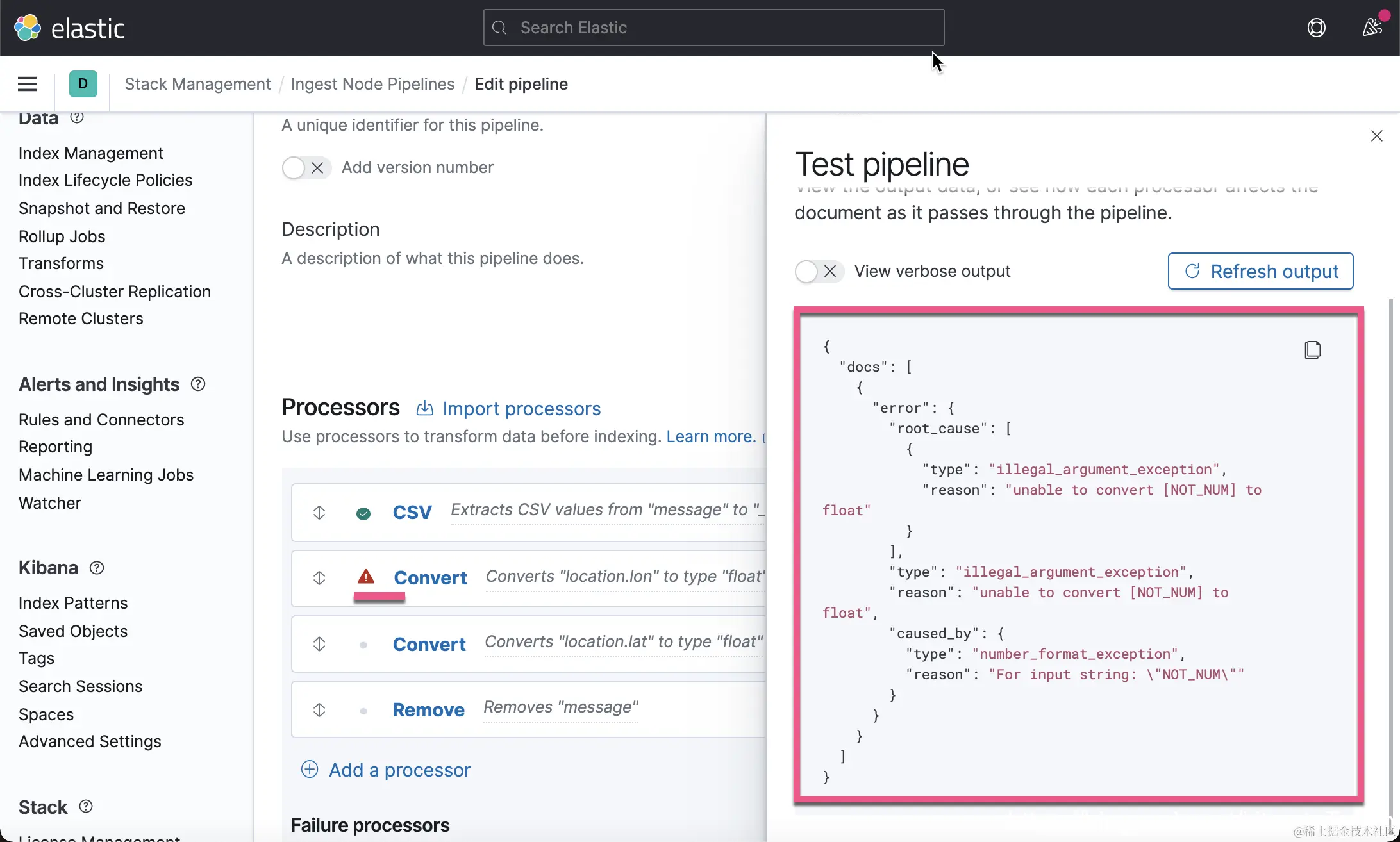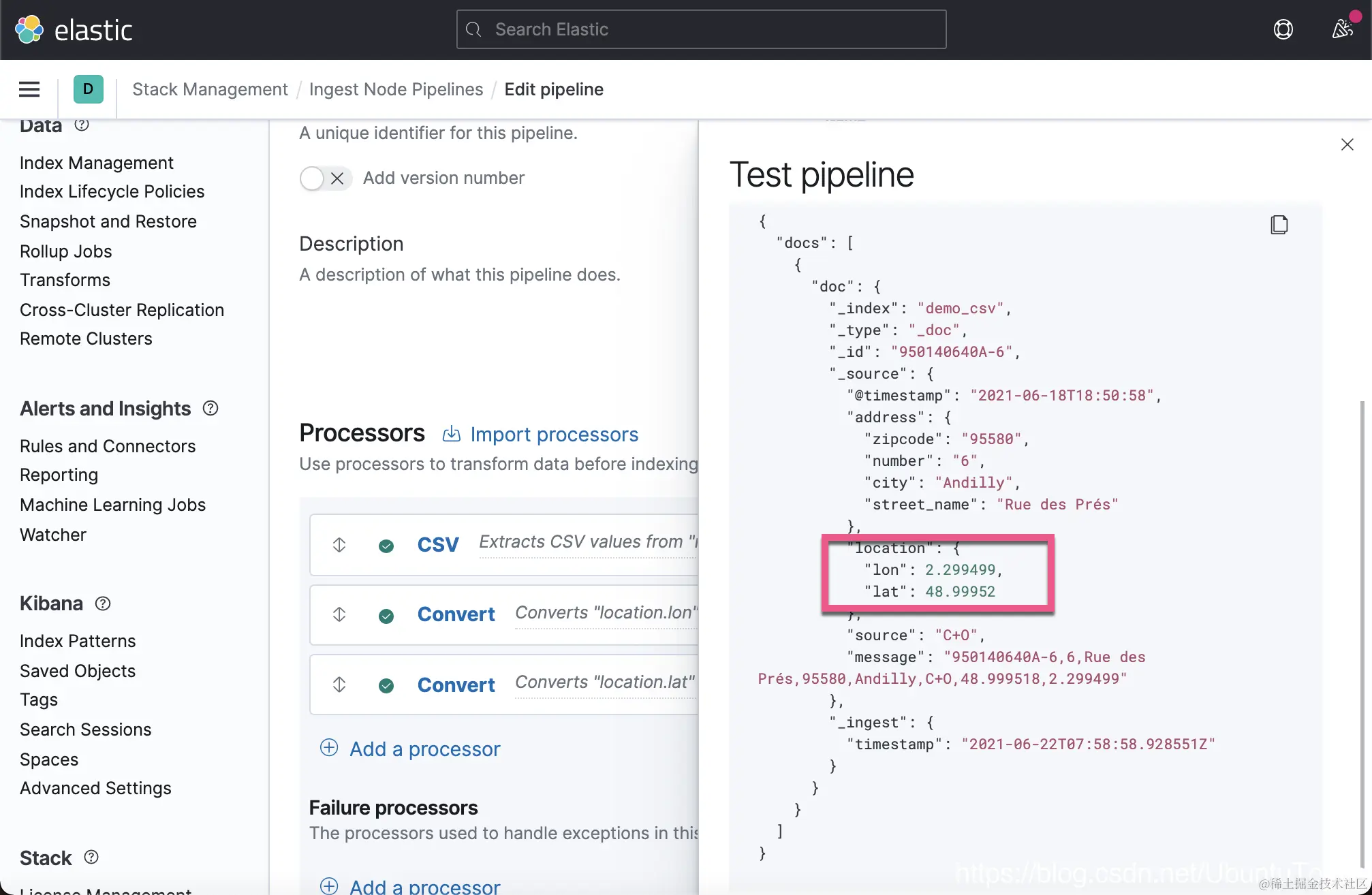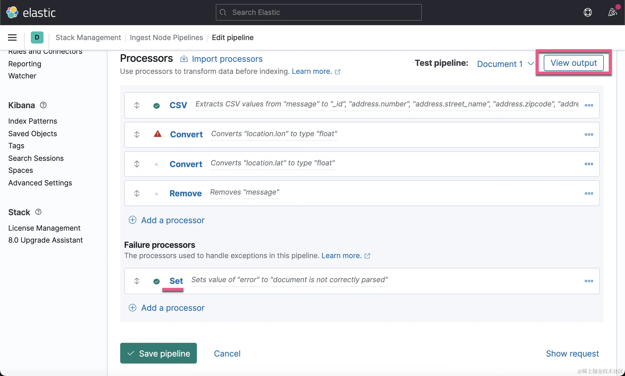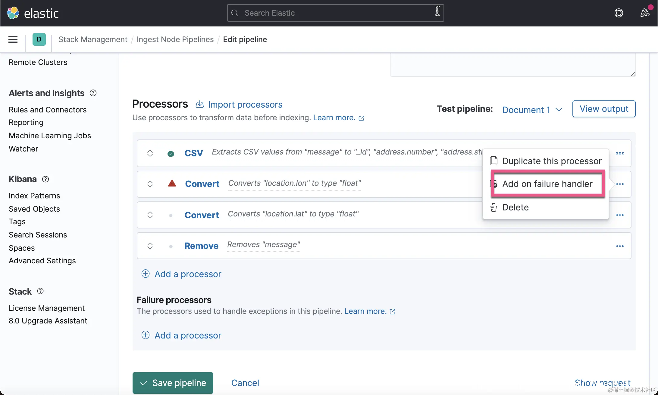 这一次,我们没有看到像上次的那种错误了,但是 location 里的内容还是不正确。一种解决办法就是删除这个 location 字段。在上面的 Failure processors 中,我们再添加一个 remove 处理器: