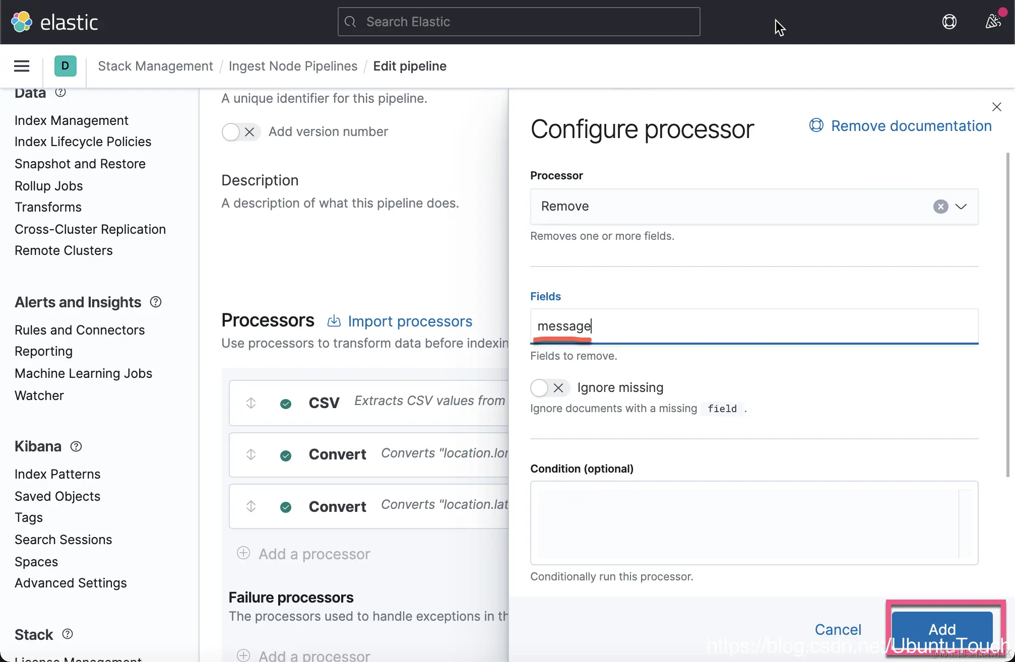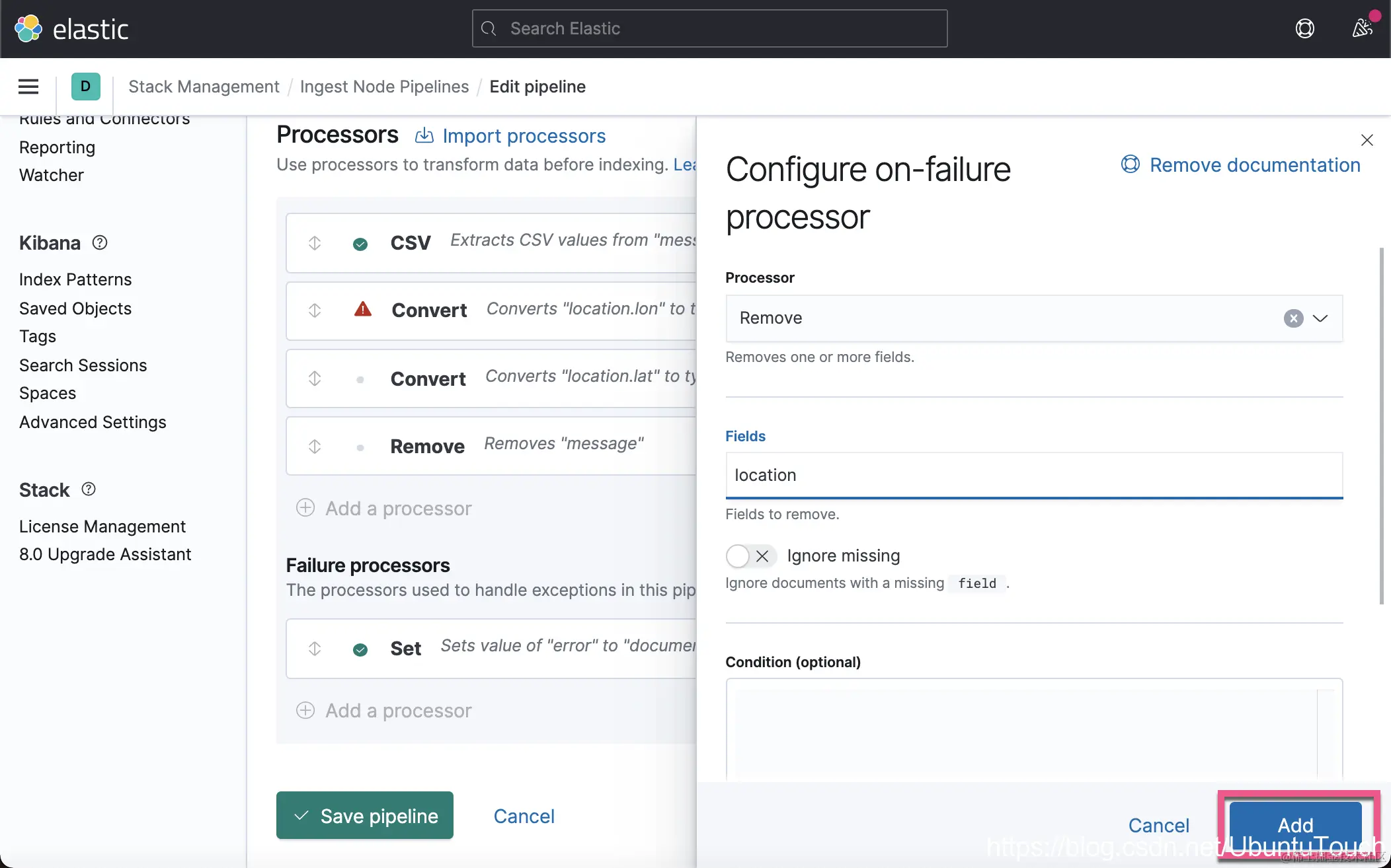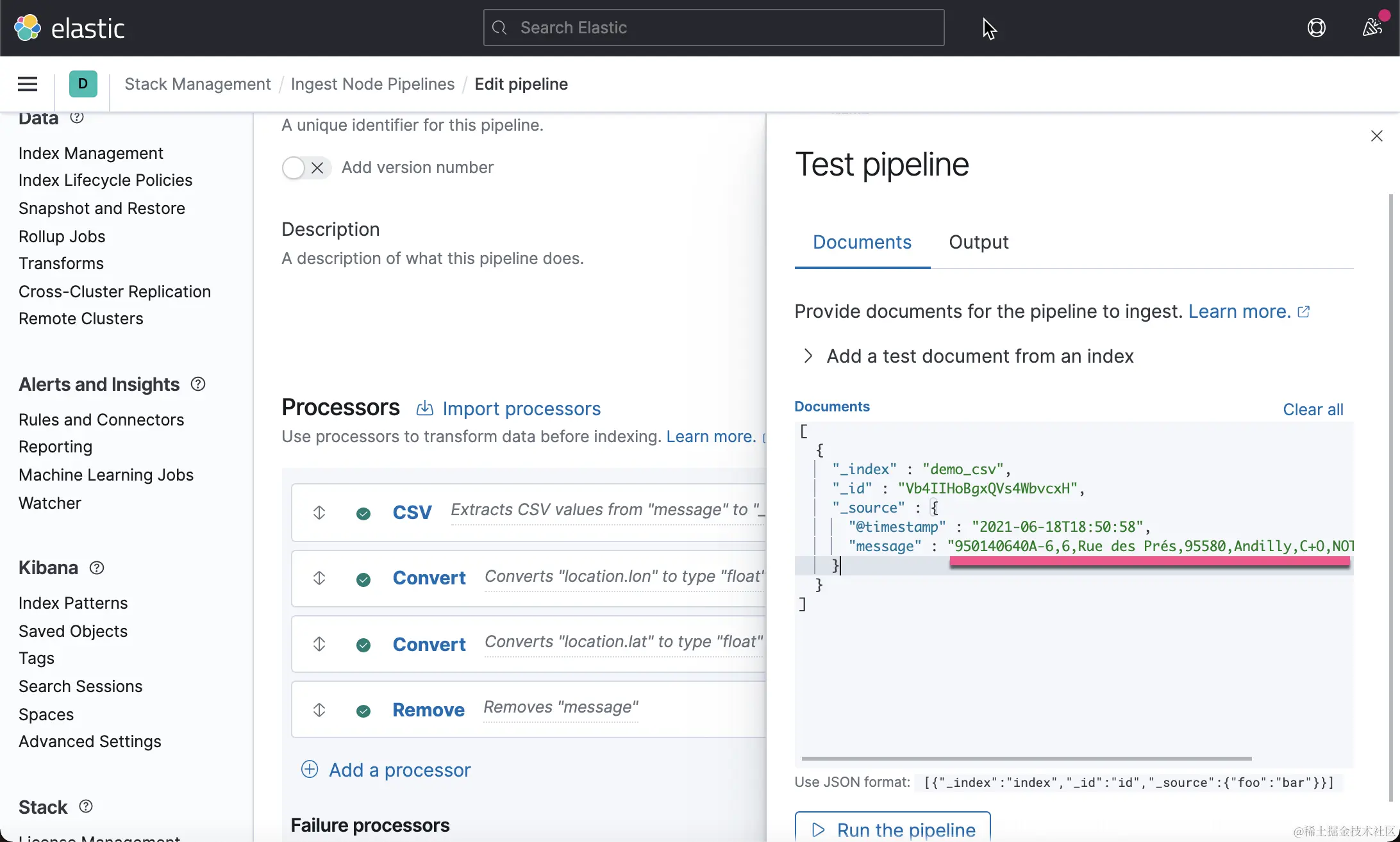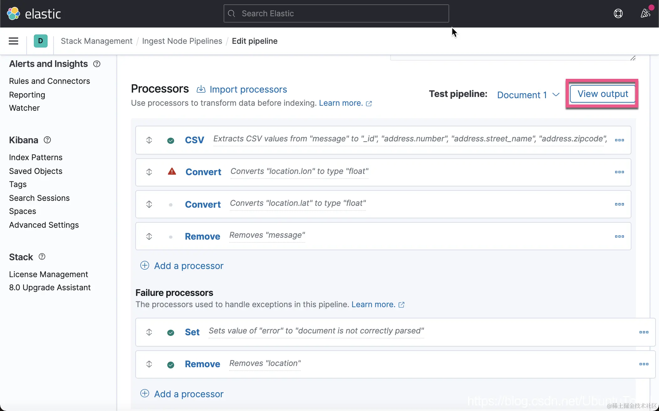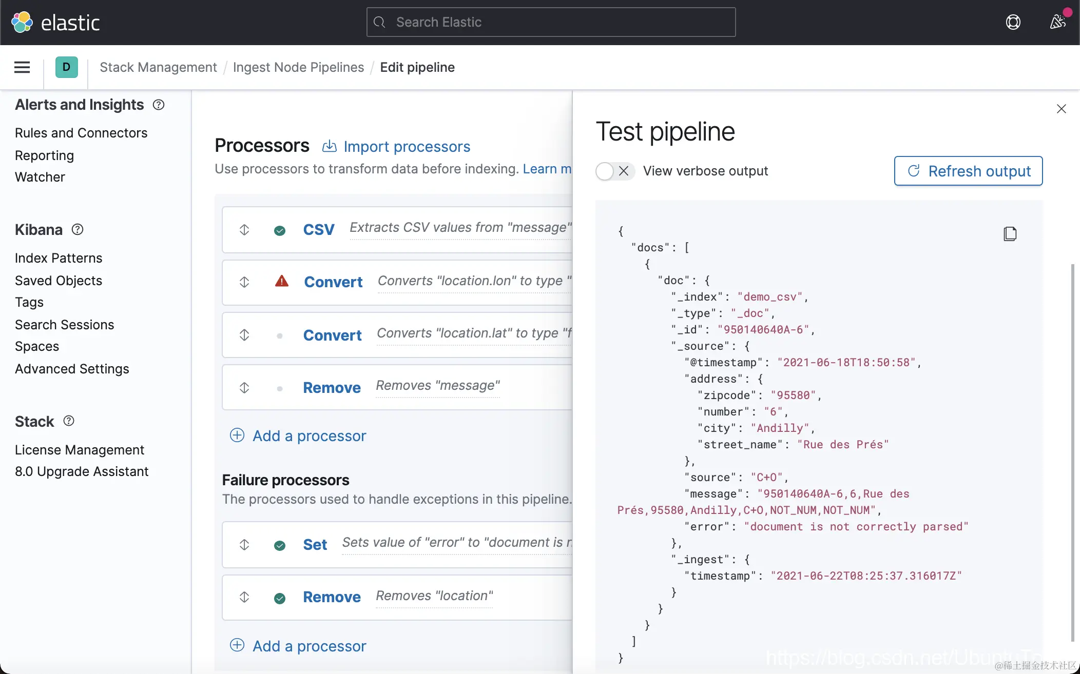 这一次,我们没有看到像上次的那种错误了,但是 location 里的内容还是不正确。一种解决办法就是删除这个 location 字段。在上面的 Failure processors 中,我们再添加一个 remove 处理器: