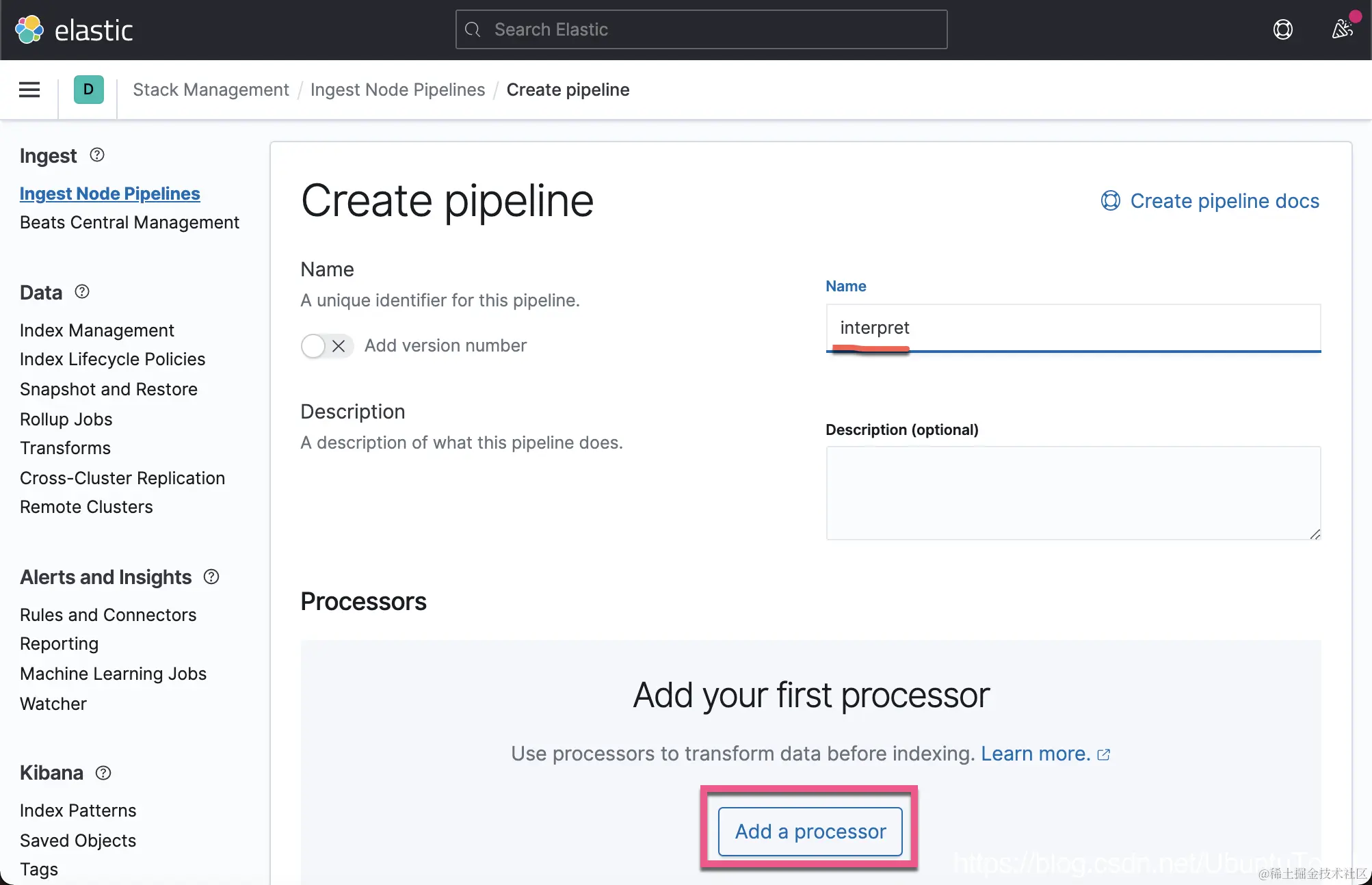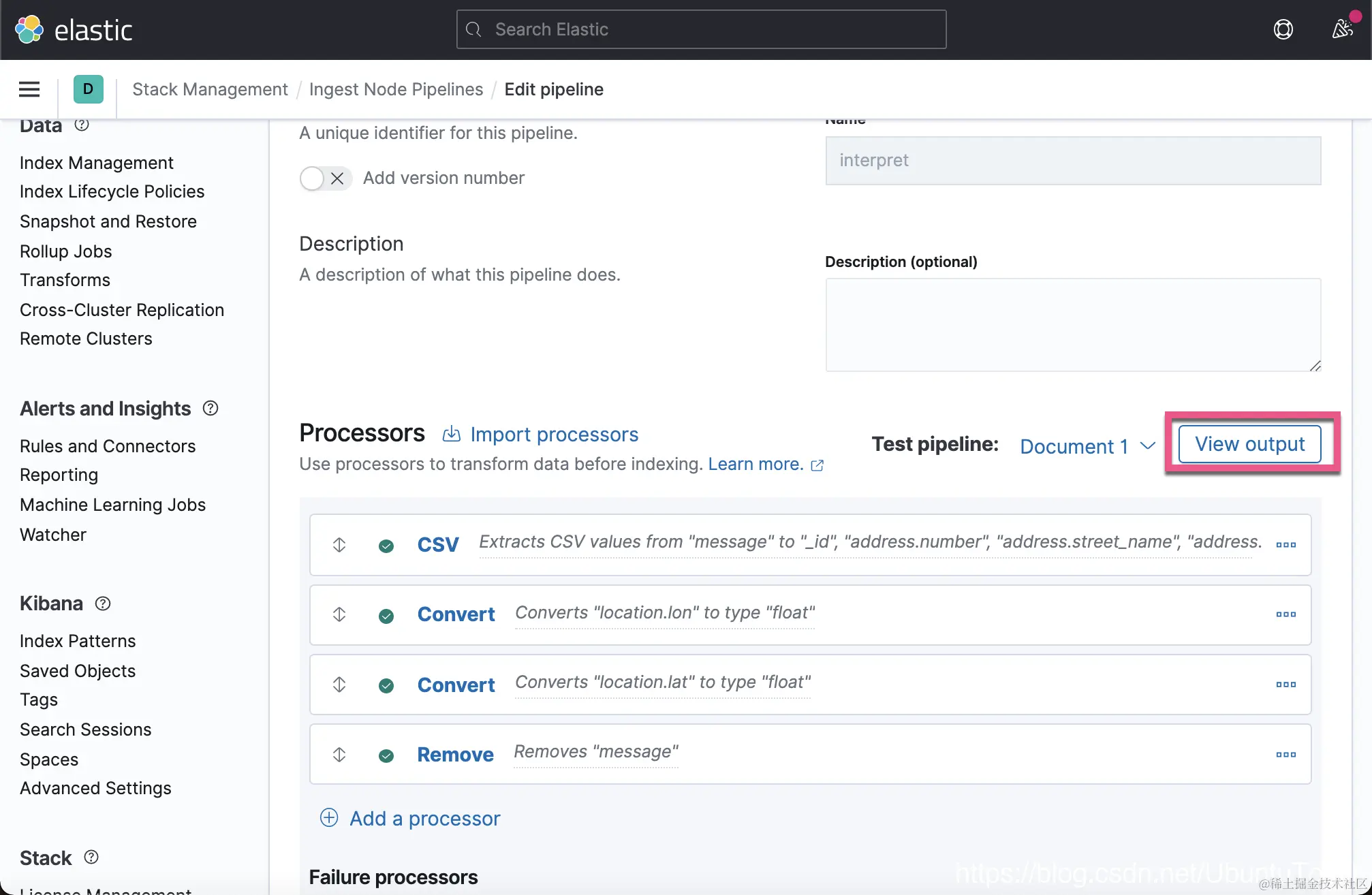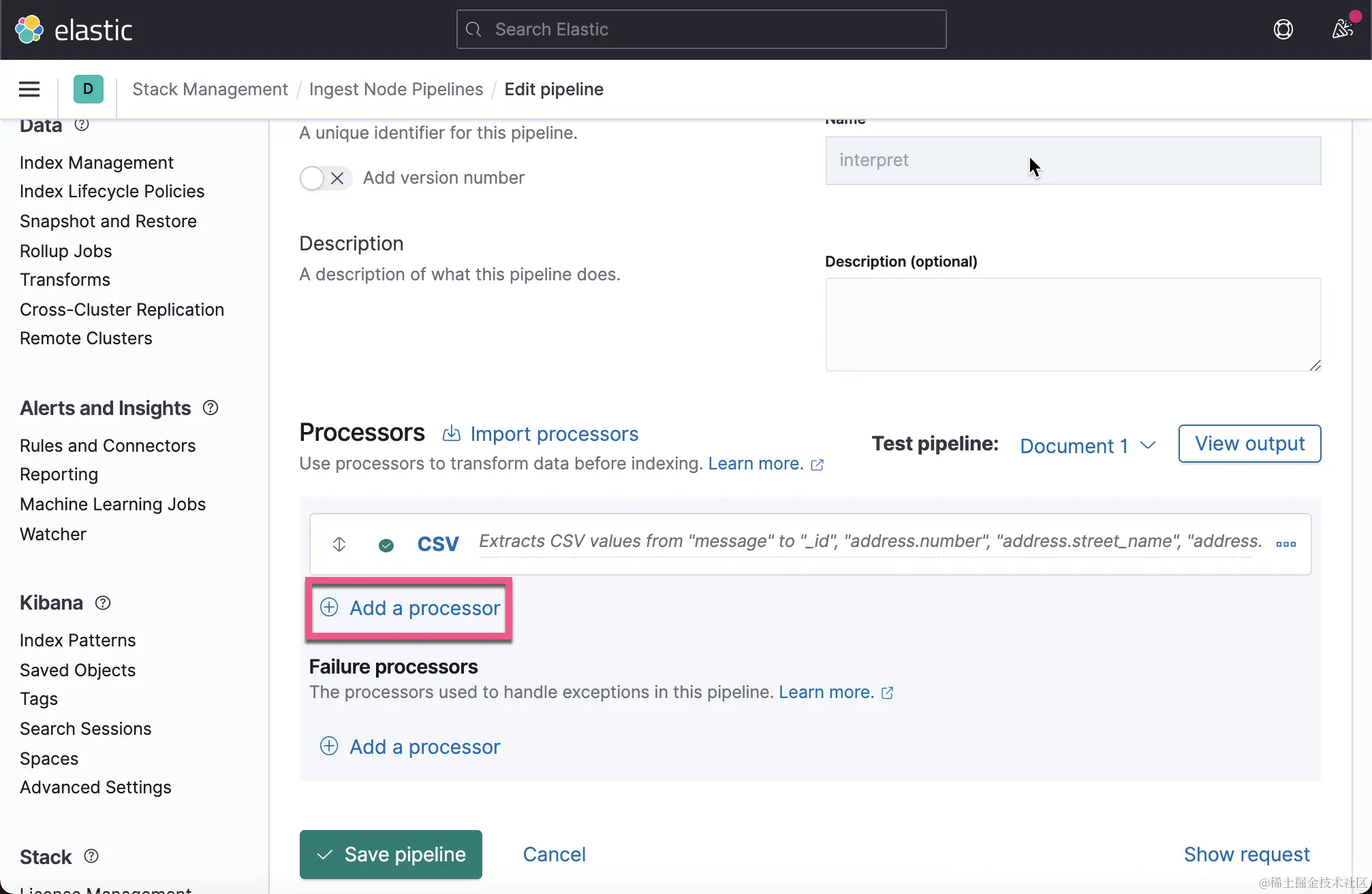 我们取名 Ingest Pipeline 为 interpret。点击上面的 Add a processor。在这次的练习中,我将使用 CSV 处理器: