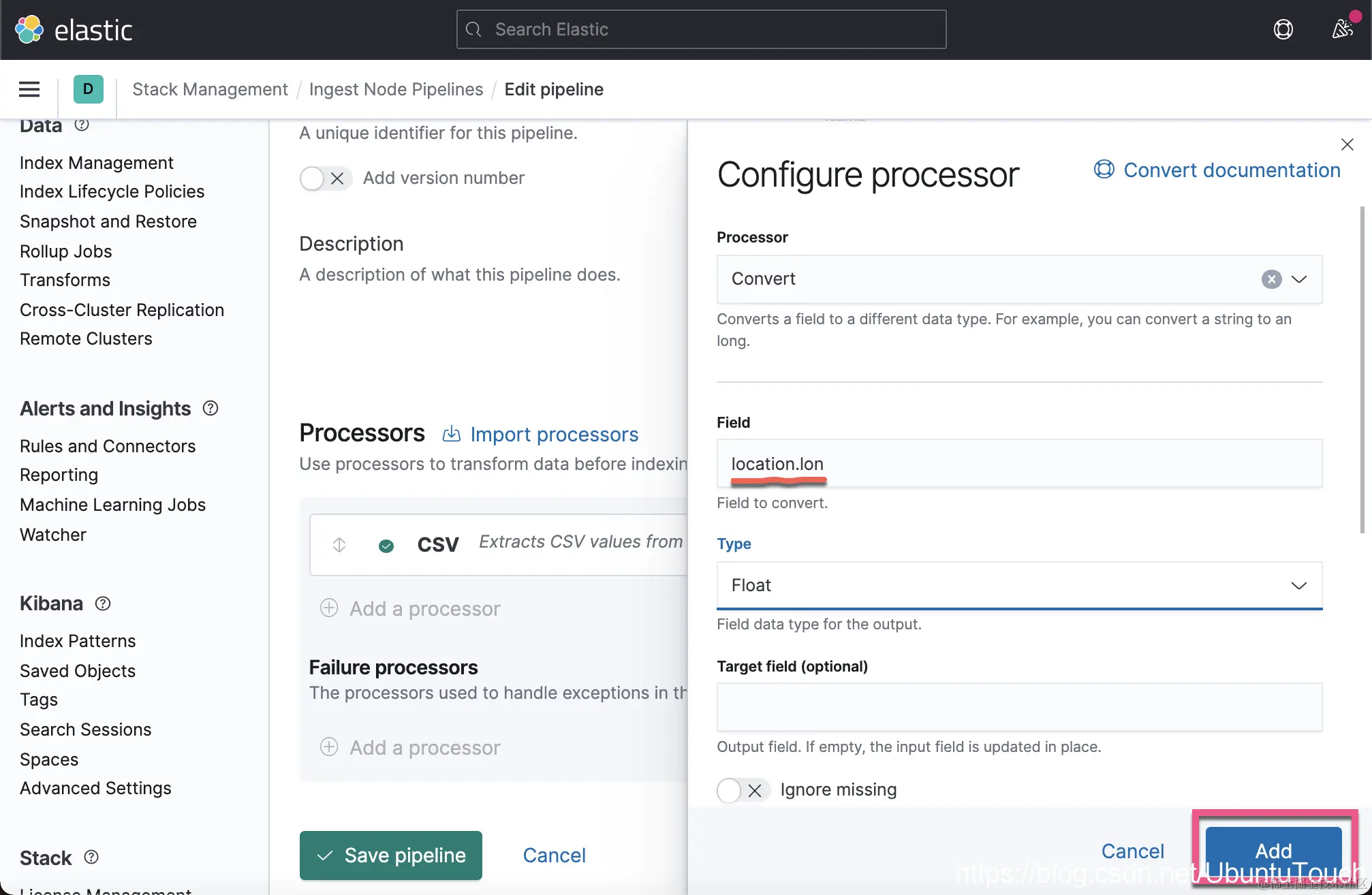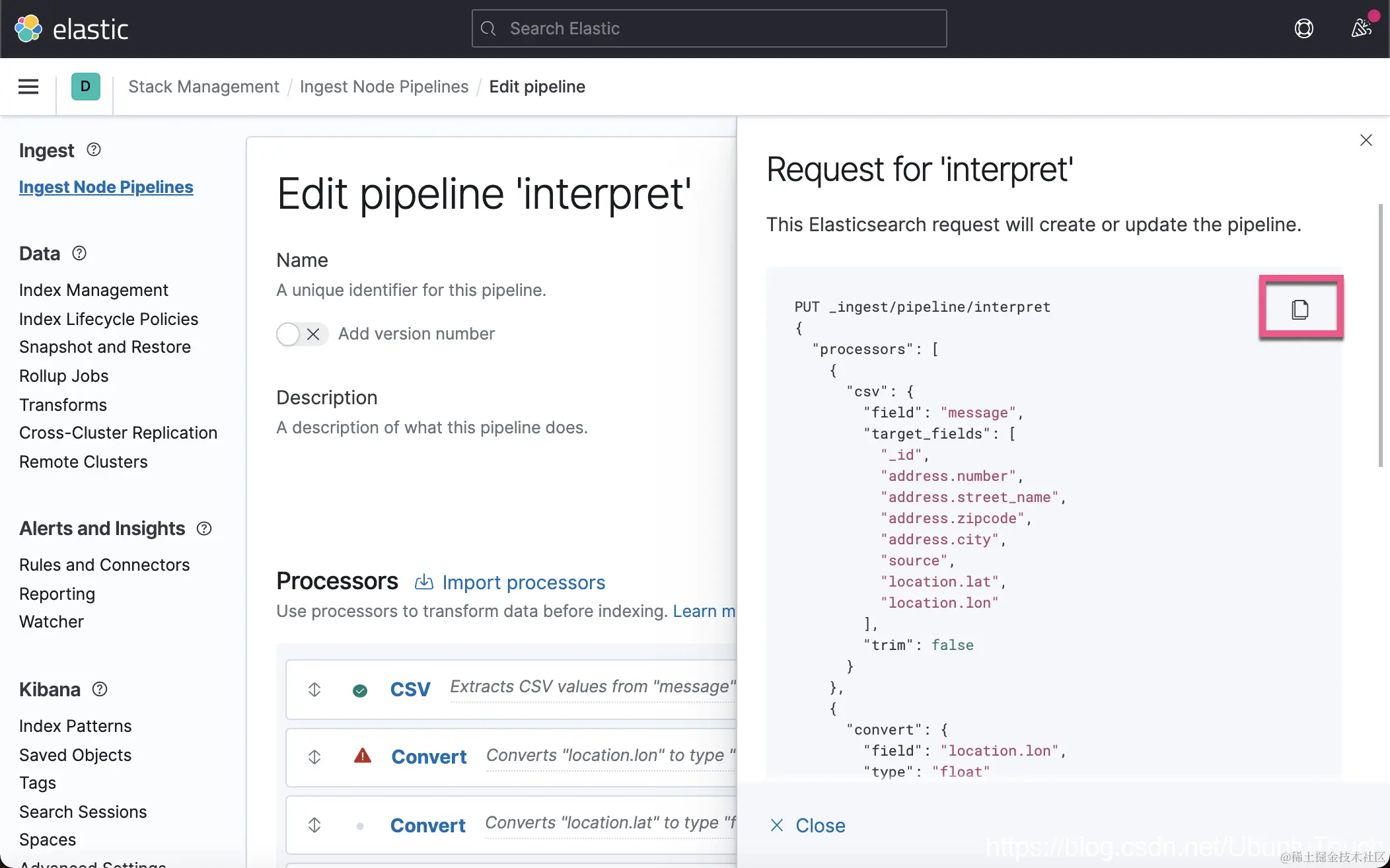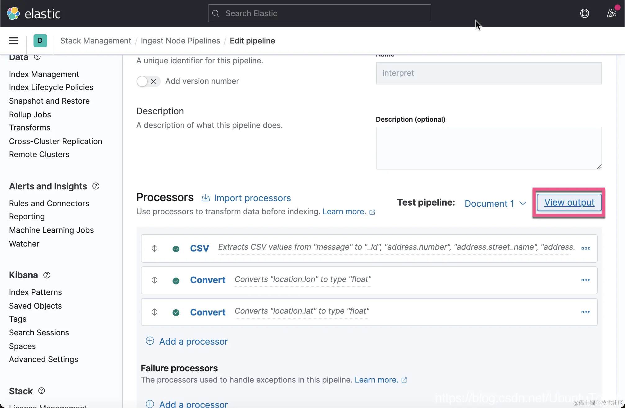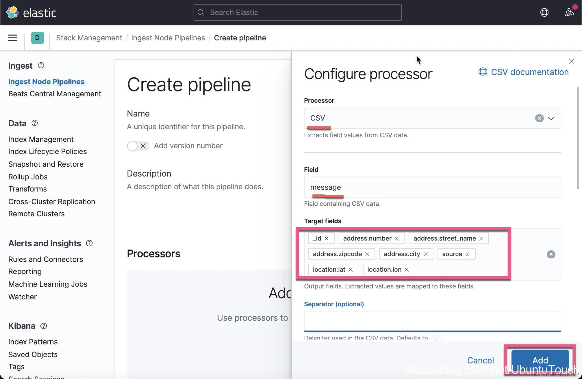 我们取名 Ingest Pipeline 为 interpret。点击上面的 Add a processor。在这次的练习中,我将使用 CSV 处理器: