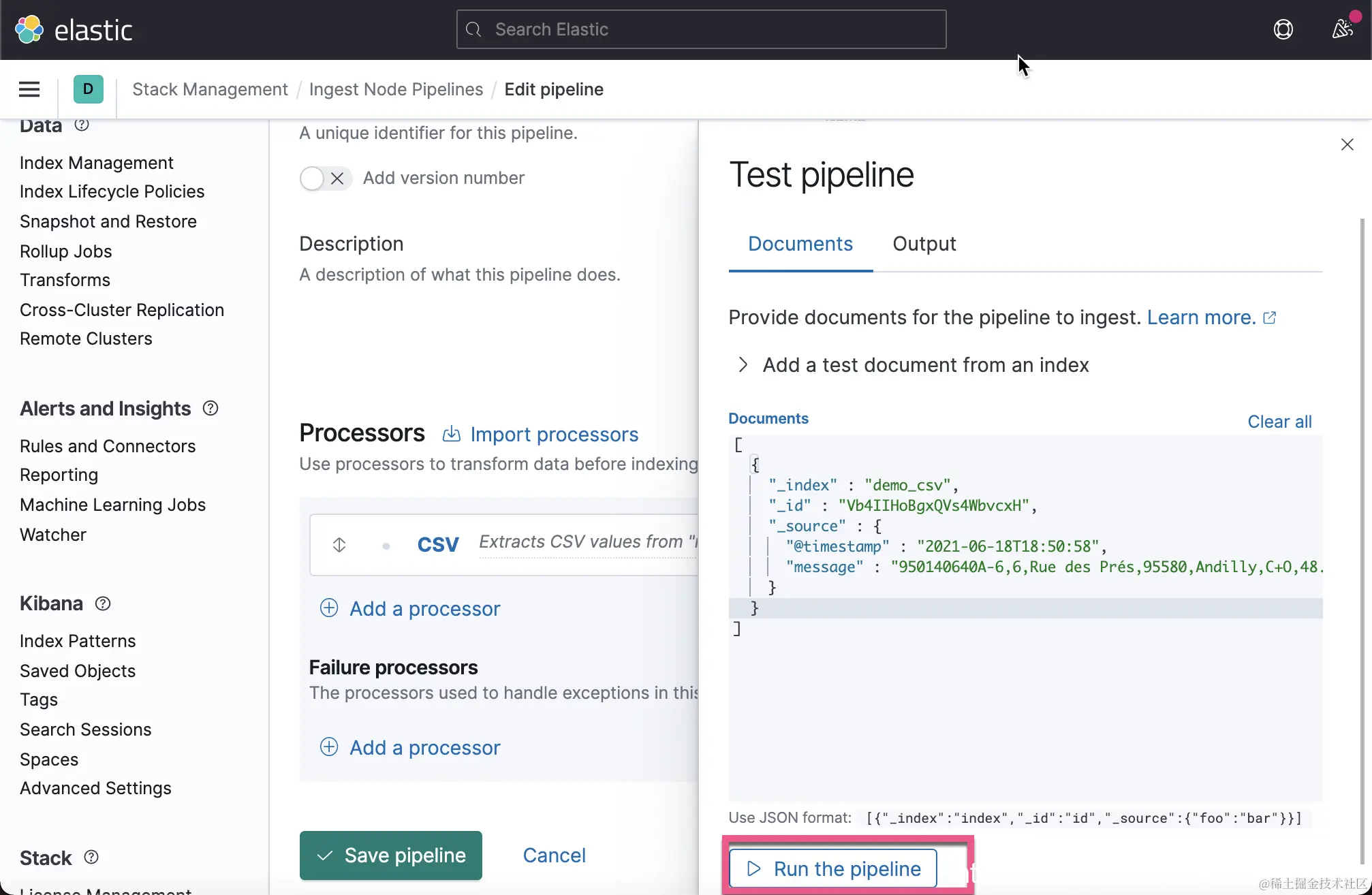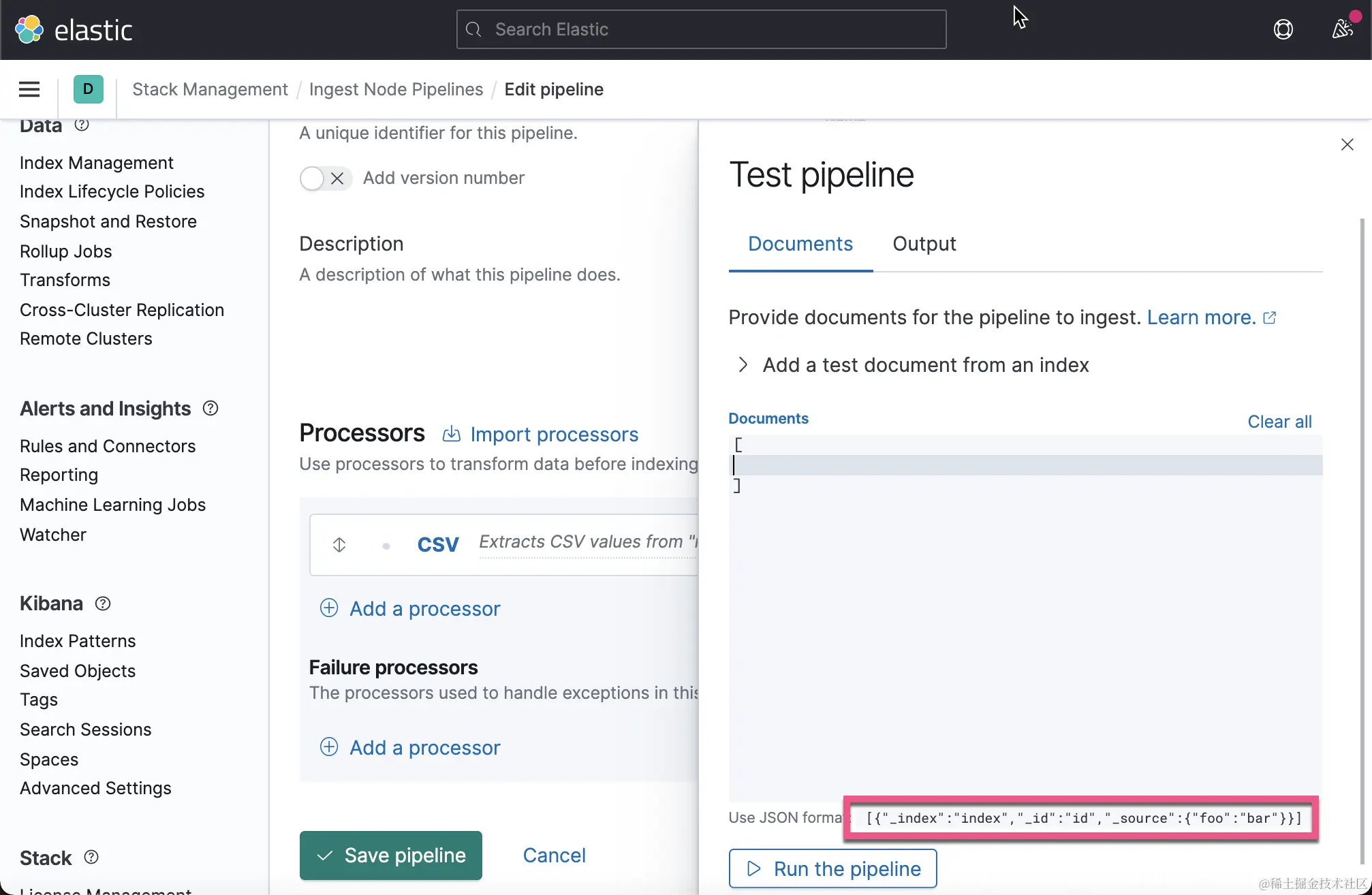 你可以甚至拷贝到 Dev Tools 中去运行。我们接下来需要点击 Save Pipeline 来保存这个 Ingest Pipeline。