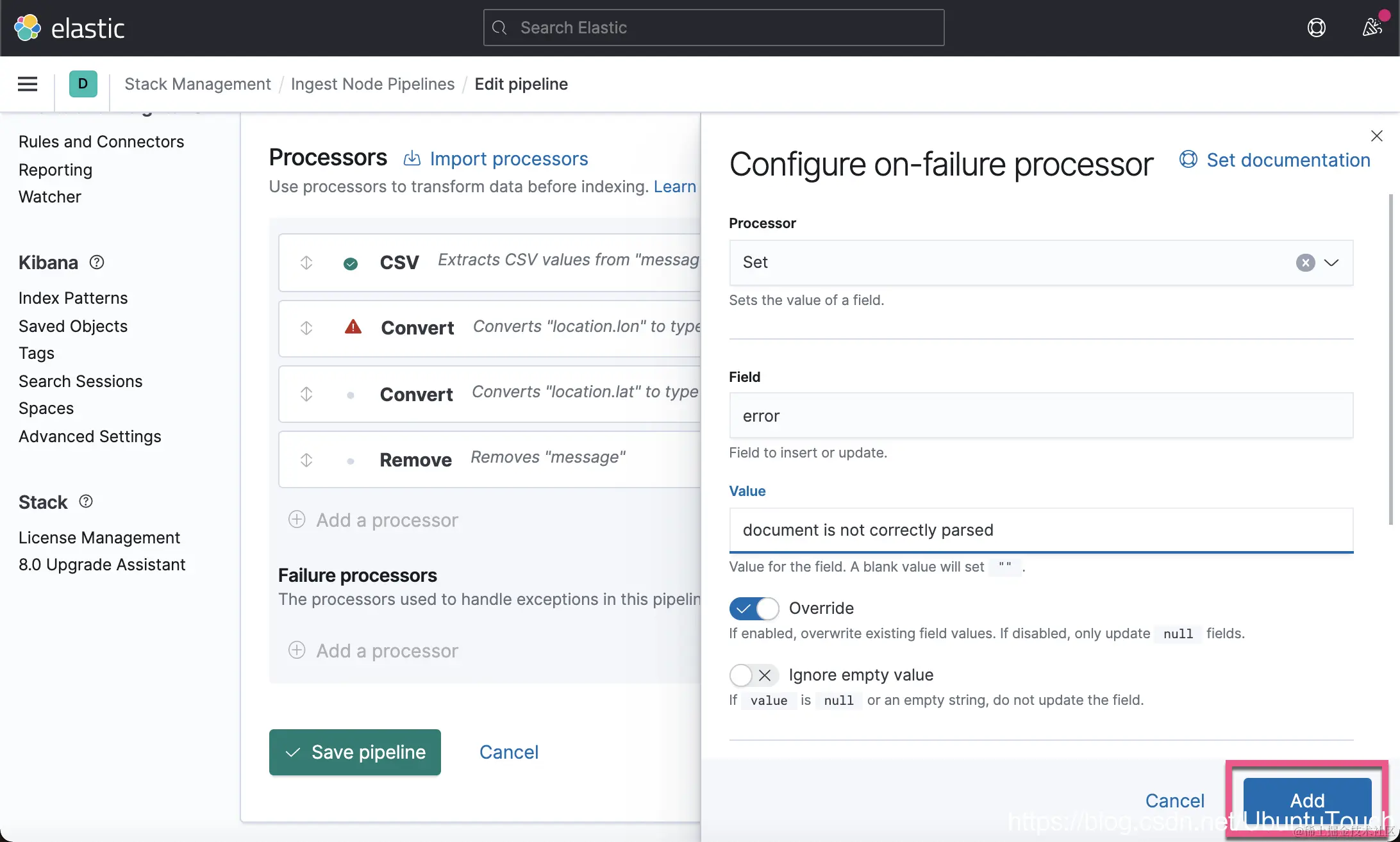 在上面,我们添加了一个 Set 处理器。它设置了一个 error 字段,并把它的内容设置为 "document is not correctly parsed"。点击上面的 Add 按钮: