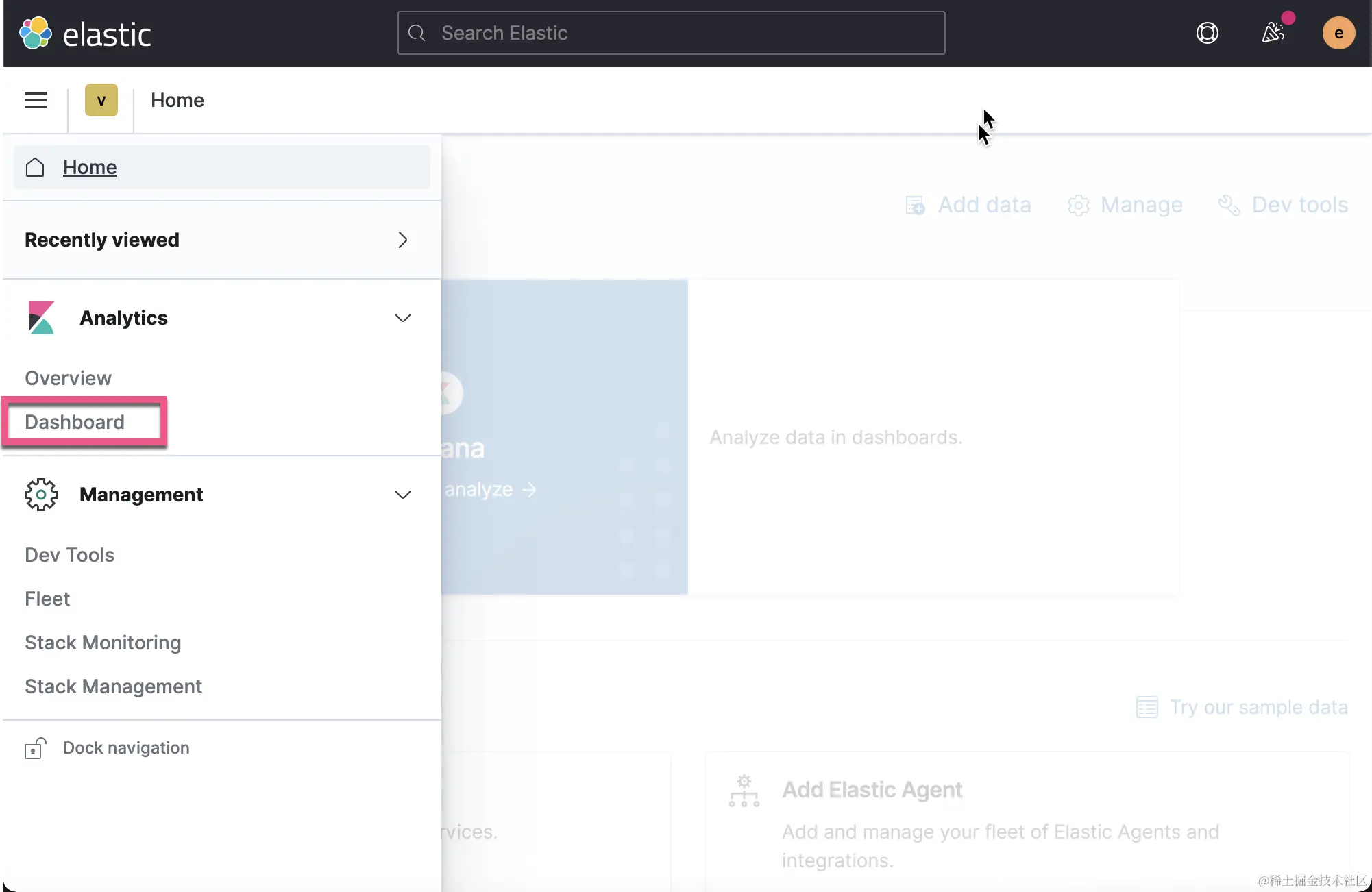 如上所示,在这个 space 里,我们只看到 Analytics 和 Management 两个部分。我们点击 Dashboard: