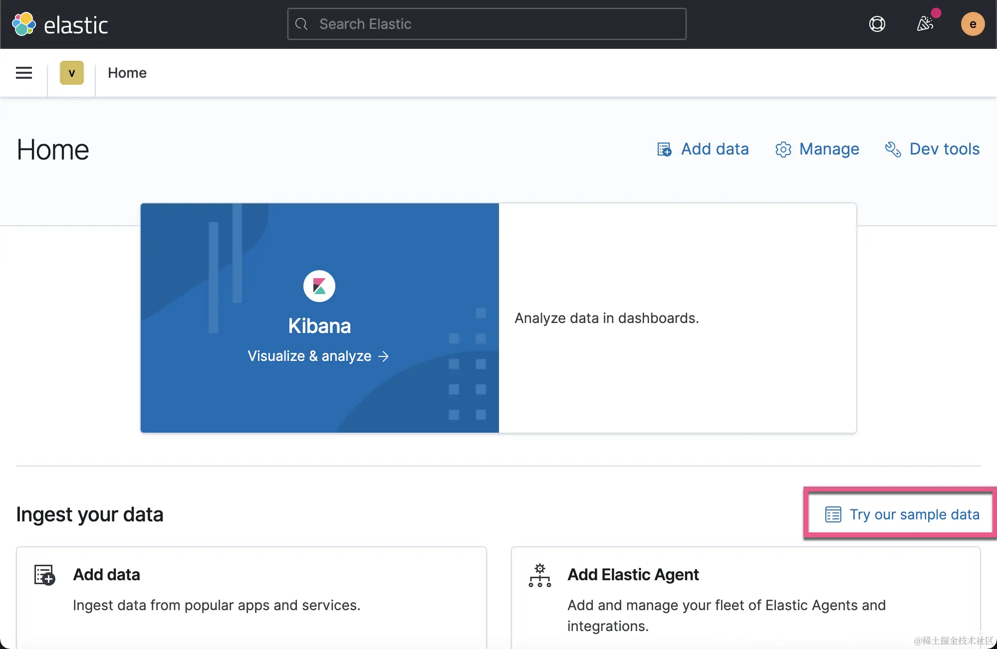 首先,我们可以看到只有 Kibana (Visualize & analyze ->)在上面显示。我们点击 Try our sample data: