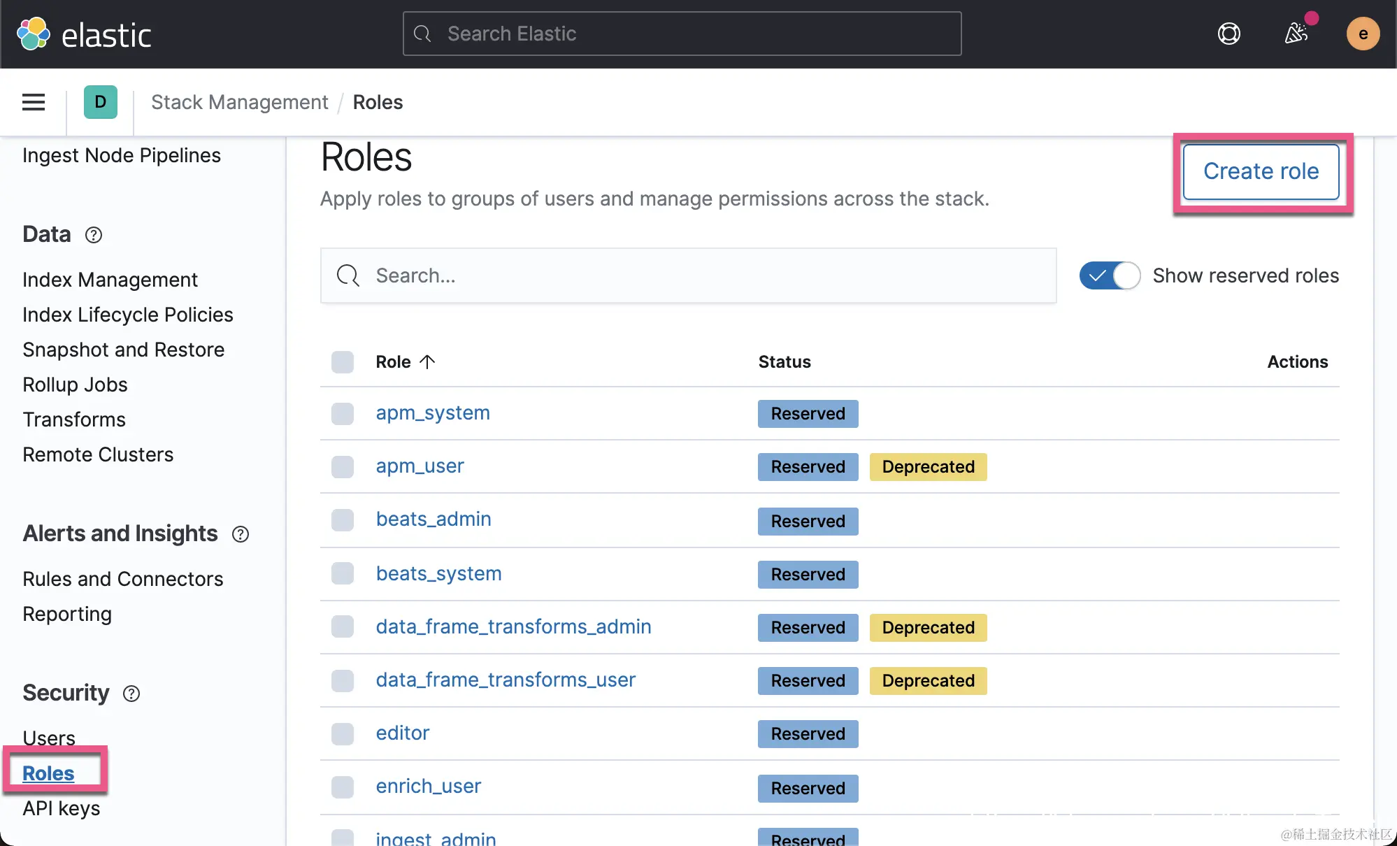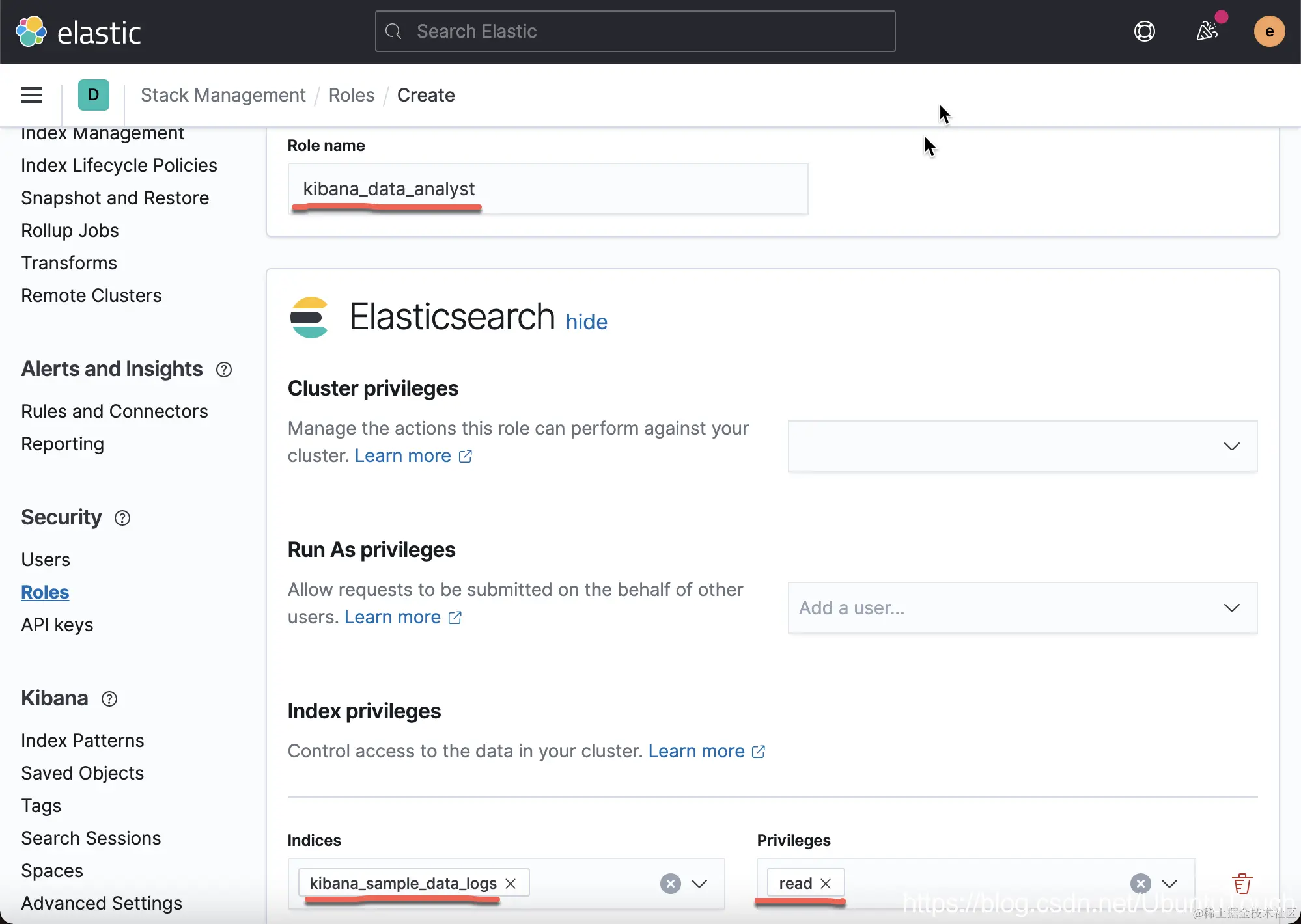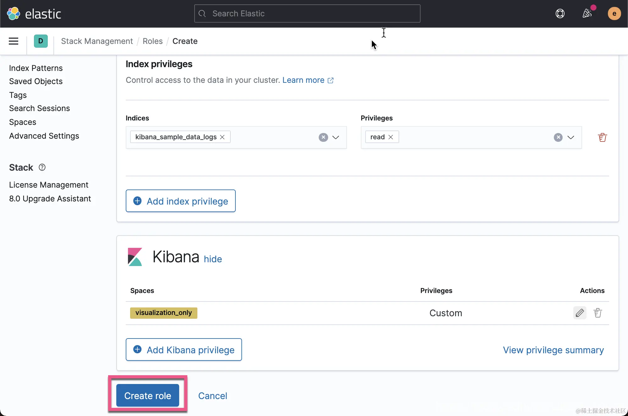点击上面的 Create role。这样我们就完成了 kibana_data_analyst 的 role 创建。