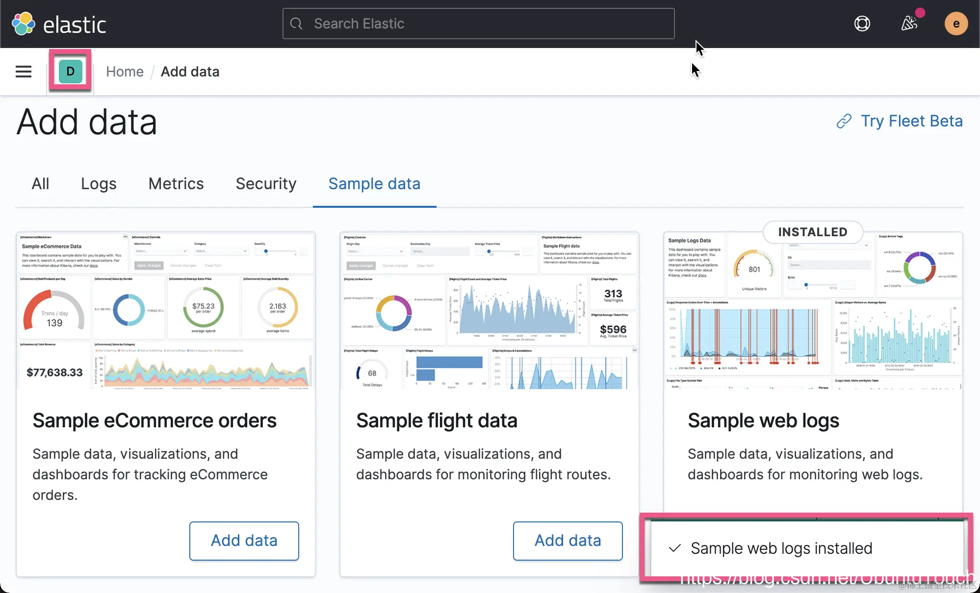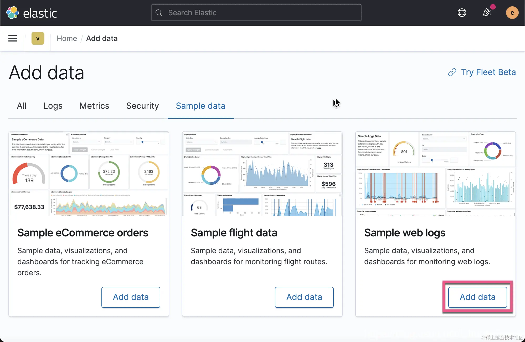点击上面的 Add data 按钮,我们可以加载我们想要的 kibana_sample_data_logs 索引到这个空间: