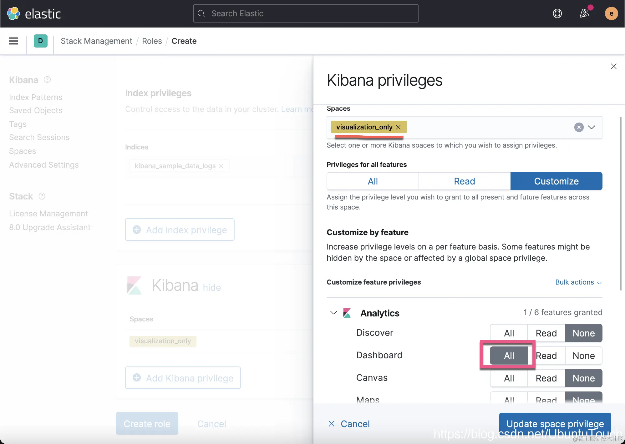 在上面,我们定义 kibana_data_analyst 这个 role。它只允许访问 kibana_sample_data_logs 索引,并只具有 read 权限。我们同时也为它定义相应的 space:
