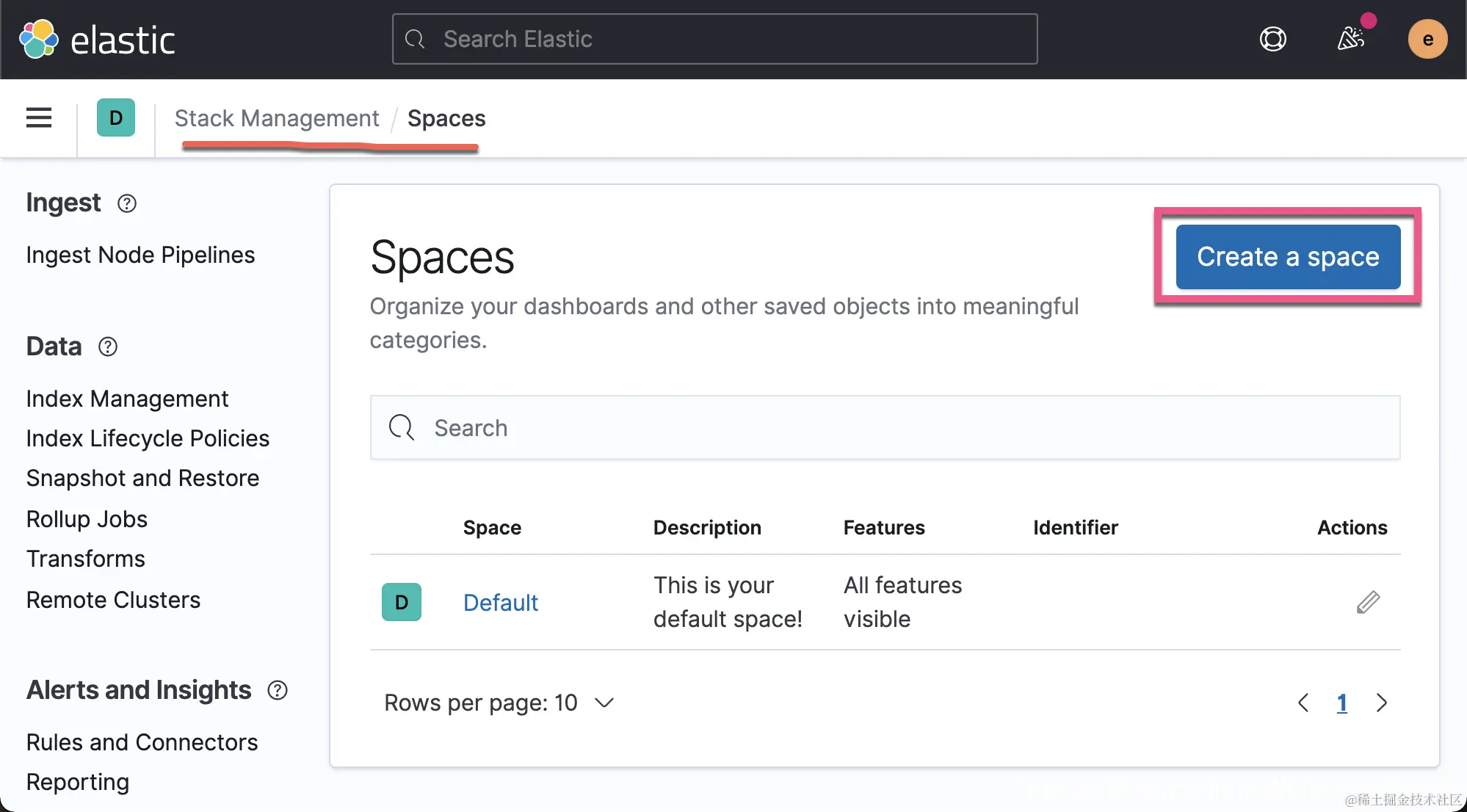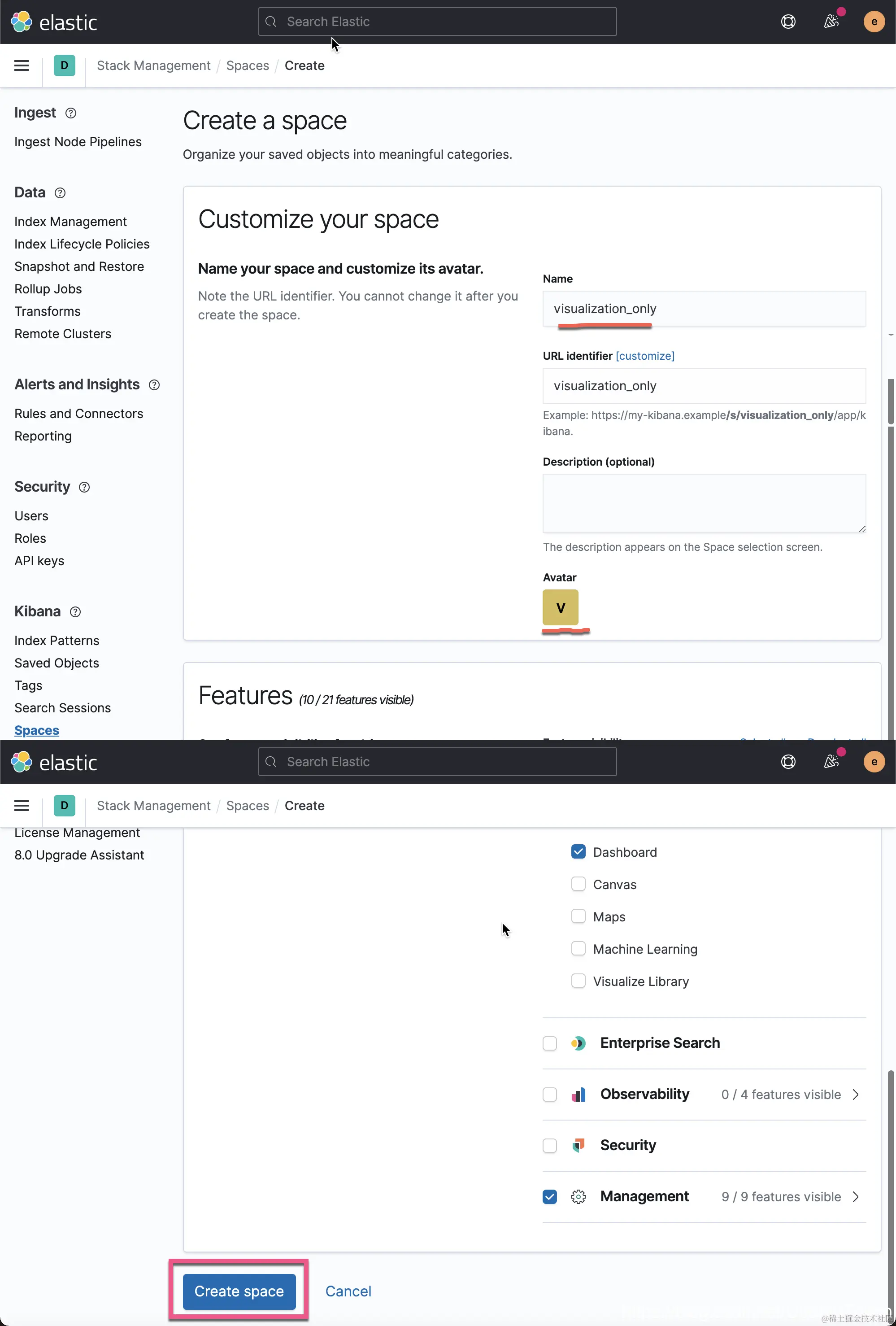 如上所示,我们在 Analytics 的部分值启动了 Dashboard。为了下面的操作方便,我同时也启动了 Management。我们在完成我们的目的过后,可以把这个也去掉。点击上面的 Create space 按钮。