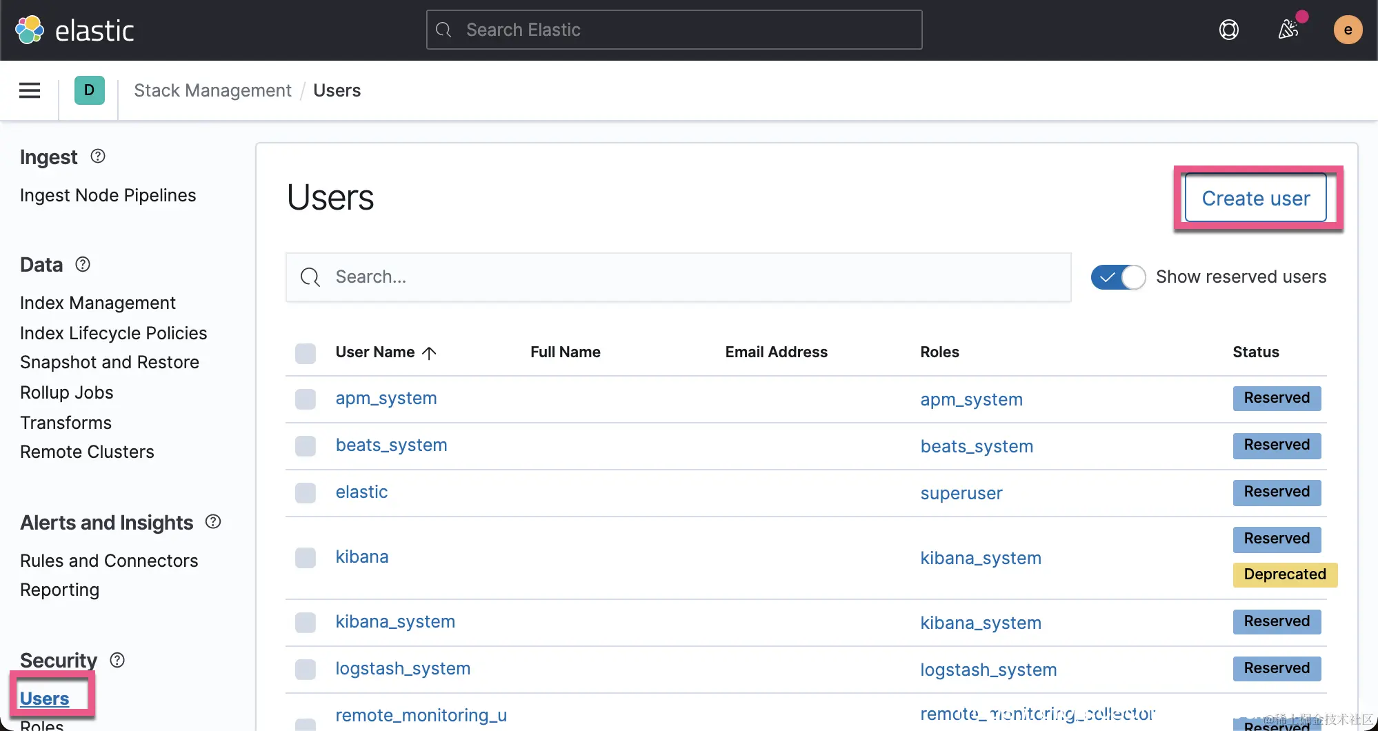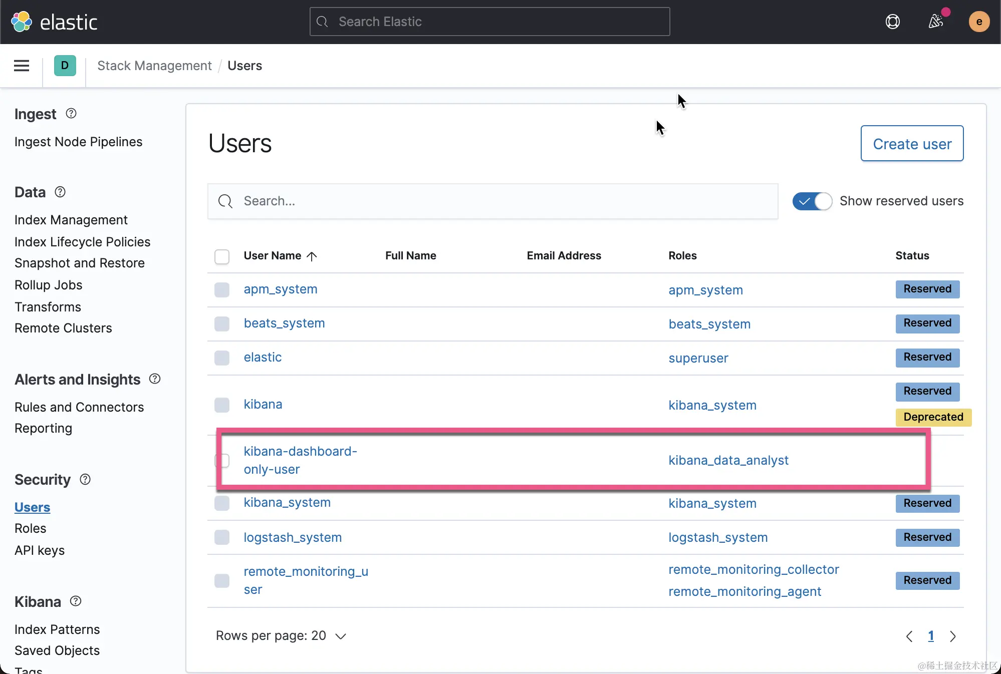 在上面我们已经创建了一个叫做 kibana_data_analyst 的 role。如果没有一个用户使用这个 role,上面的 role 是没有任何意义的。我们点击 Stack Management/Users 来创建一个 user: