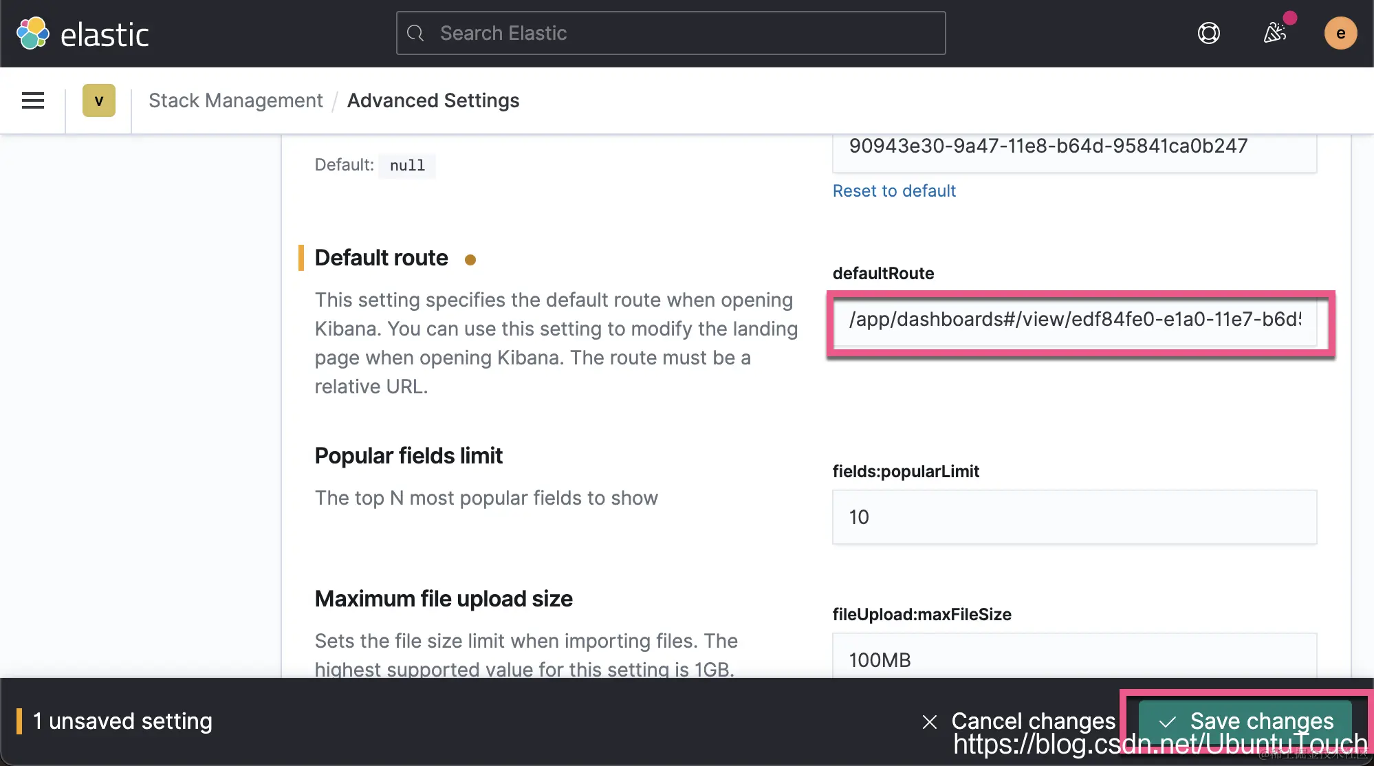 它的意思是当打开这个 Space 后,默认的页面就是到这个页面,也就是 Web Traffic Dashboard。点击上面的 Save changes 按钮。我么接下来切回到 Default space,然后在切换回到 visualization_only space,我们看看默认的页面是否有所变化: