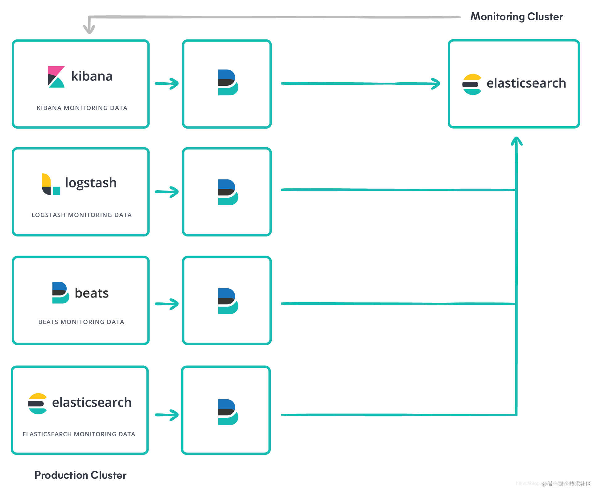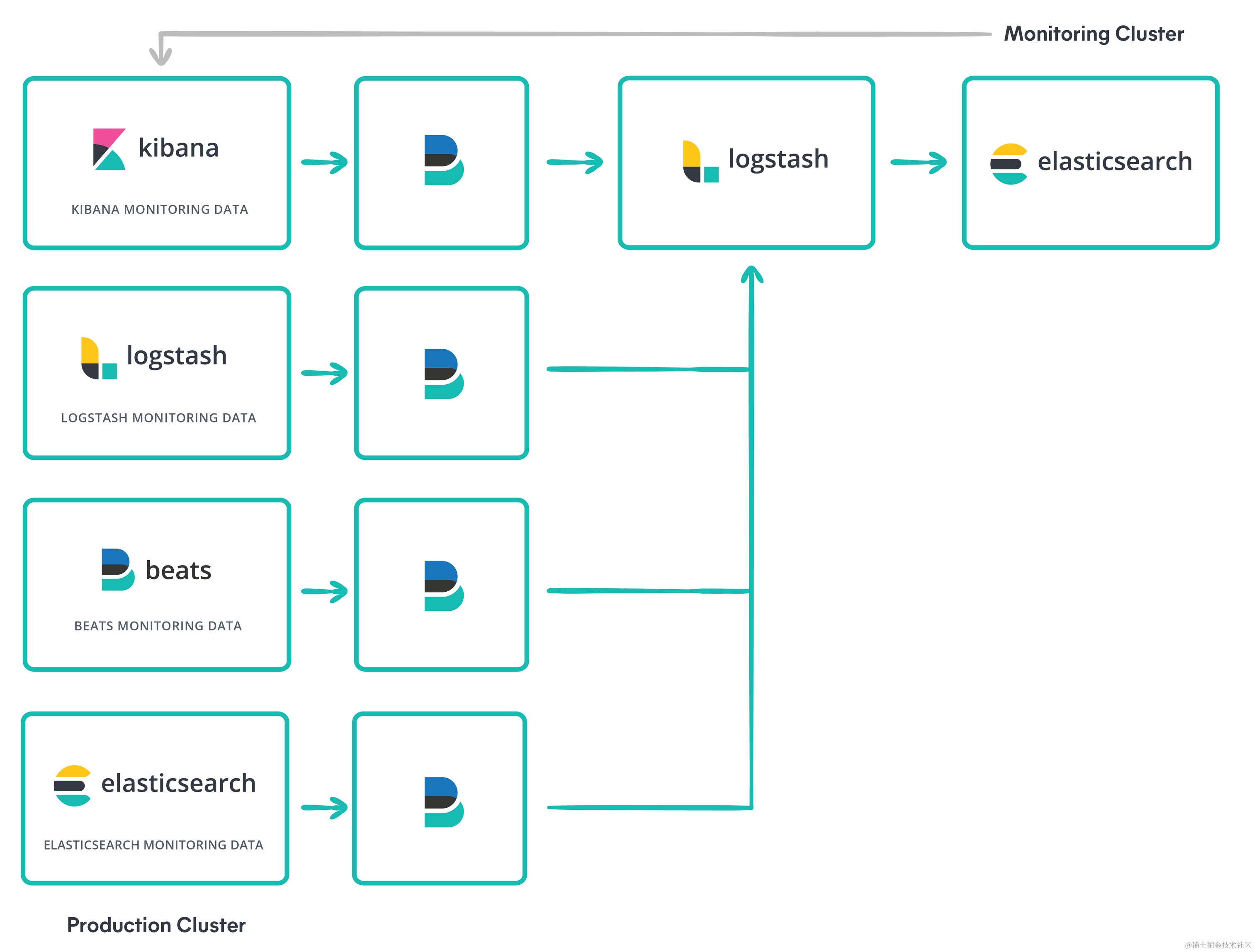 - 使用 elasticsearch 输出插件将堆栈监控数据发送到监控集群。