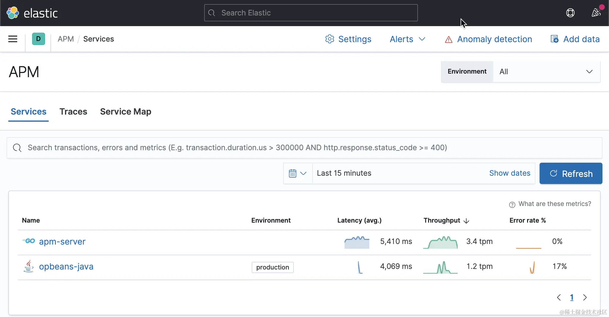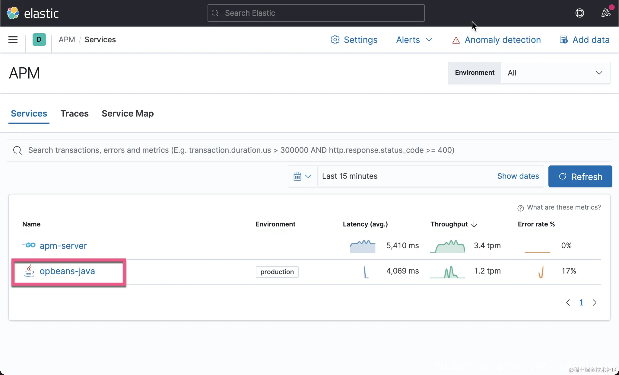 在上面,我们可以看到有两个 Services。上面显示了一些粗略的信息。我们点击上面的 opbeans-java 链接。我们可以看到这个应用的 APM overview 情况。