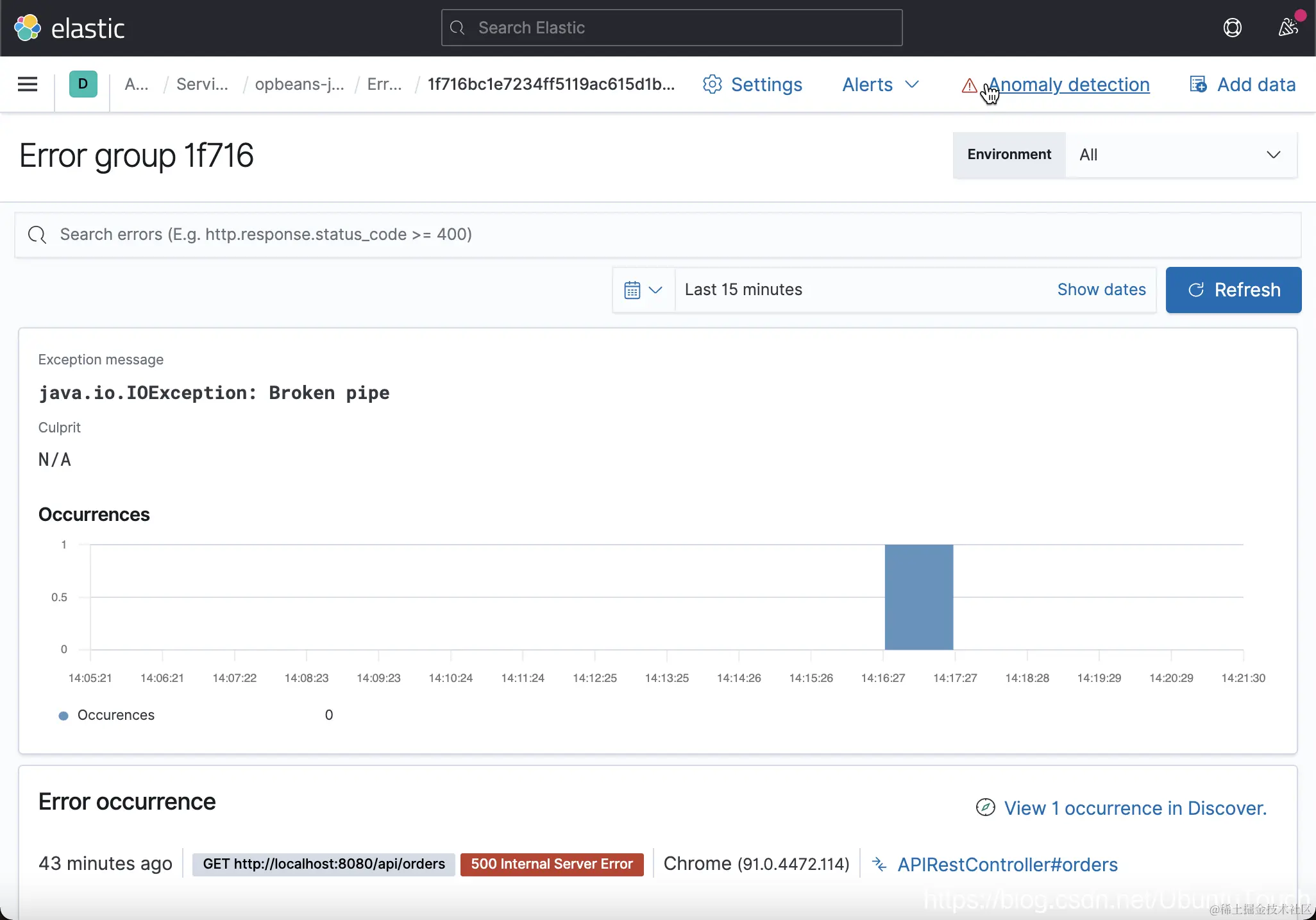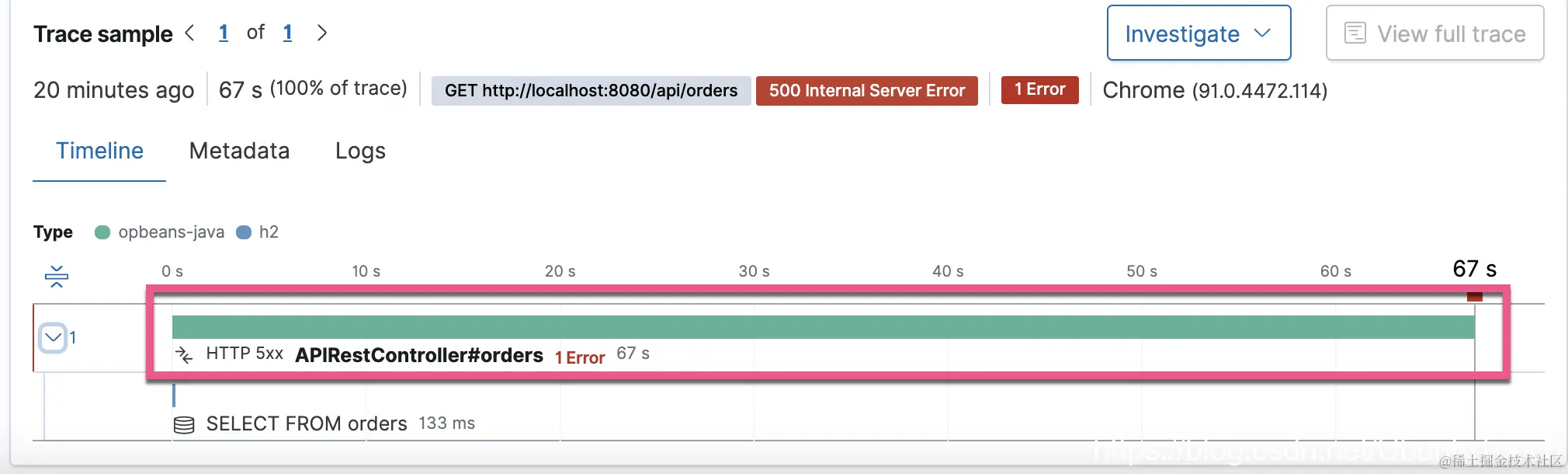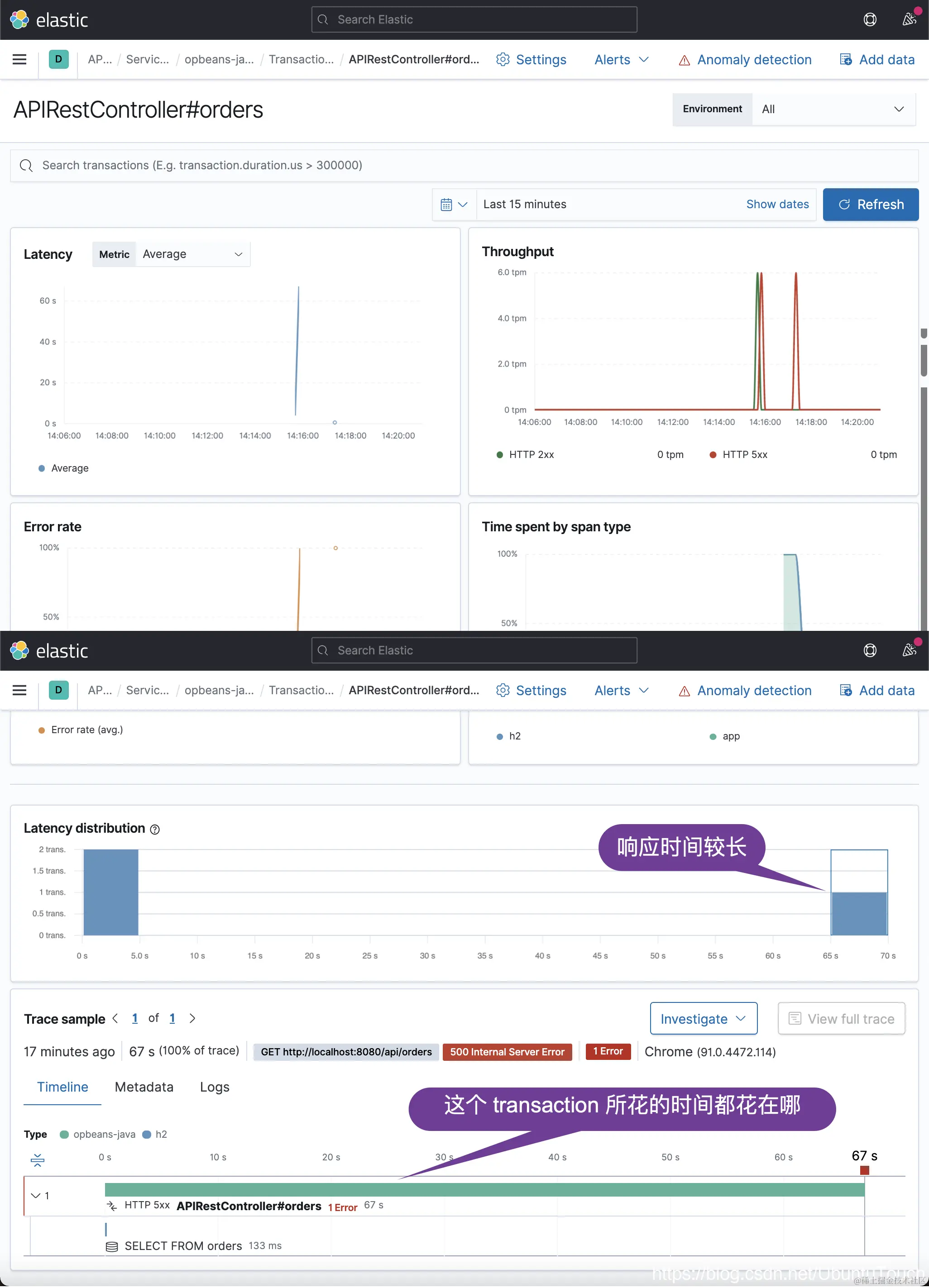 从上面,我们可以看到各种指标信息。比如针对 Transanctions 来说,我们看到对我们影响最大的一个 API 接口是 APIRestController#orders,而且它还有一些错误: