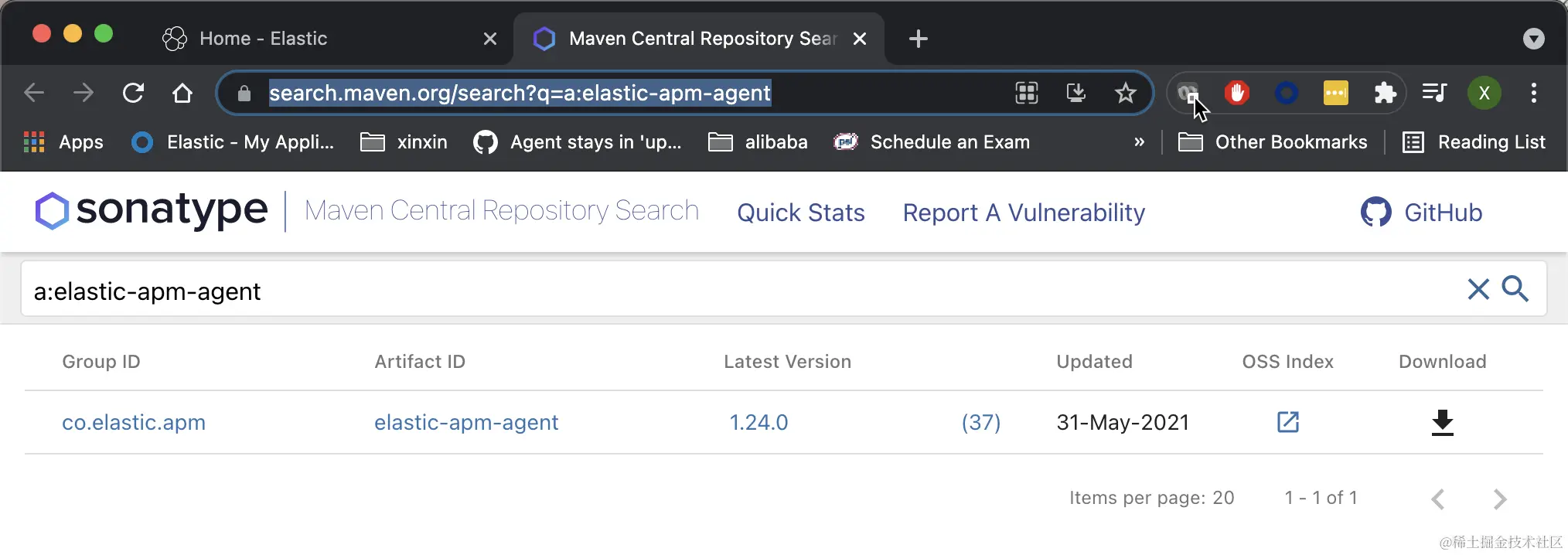 由于我们已经安装好 Elastic Stack 了,所以我们直接跳过前面的部分来直接配置 Java APM agent。我们首先点击上面的 Maven Central 链接来下载 agent jar,并把相应的文件保存于 opbean-java/opbean 目录下: