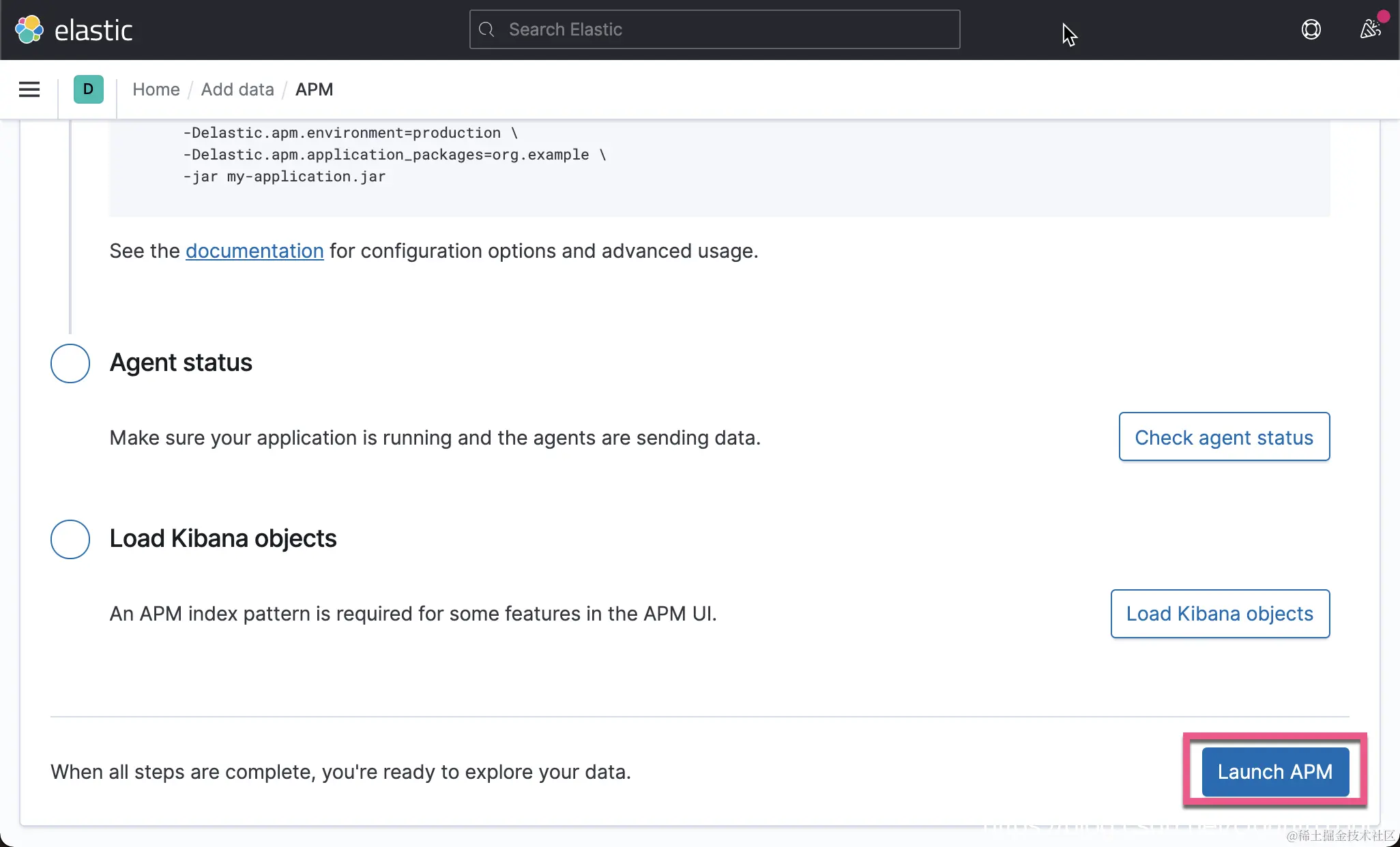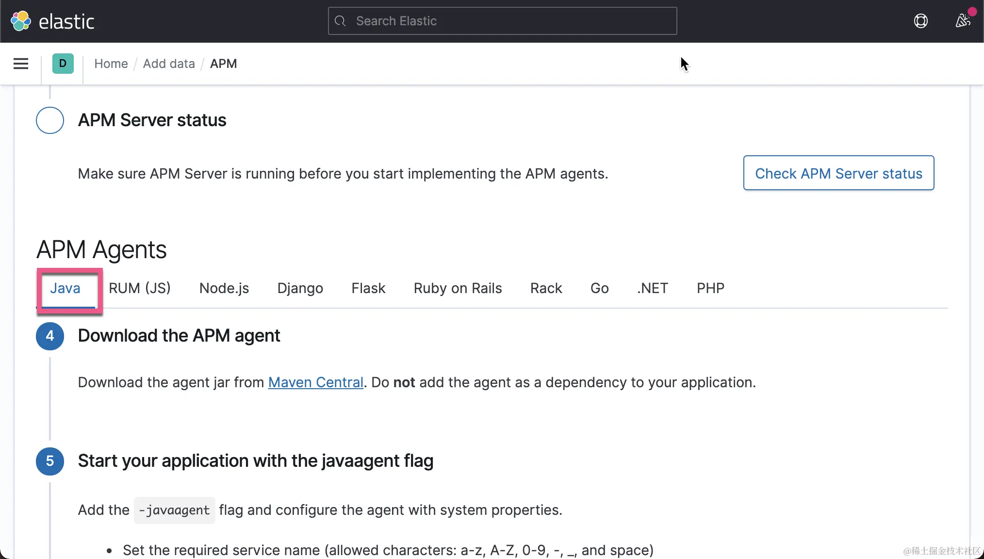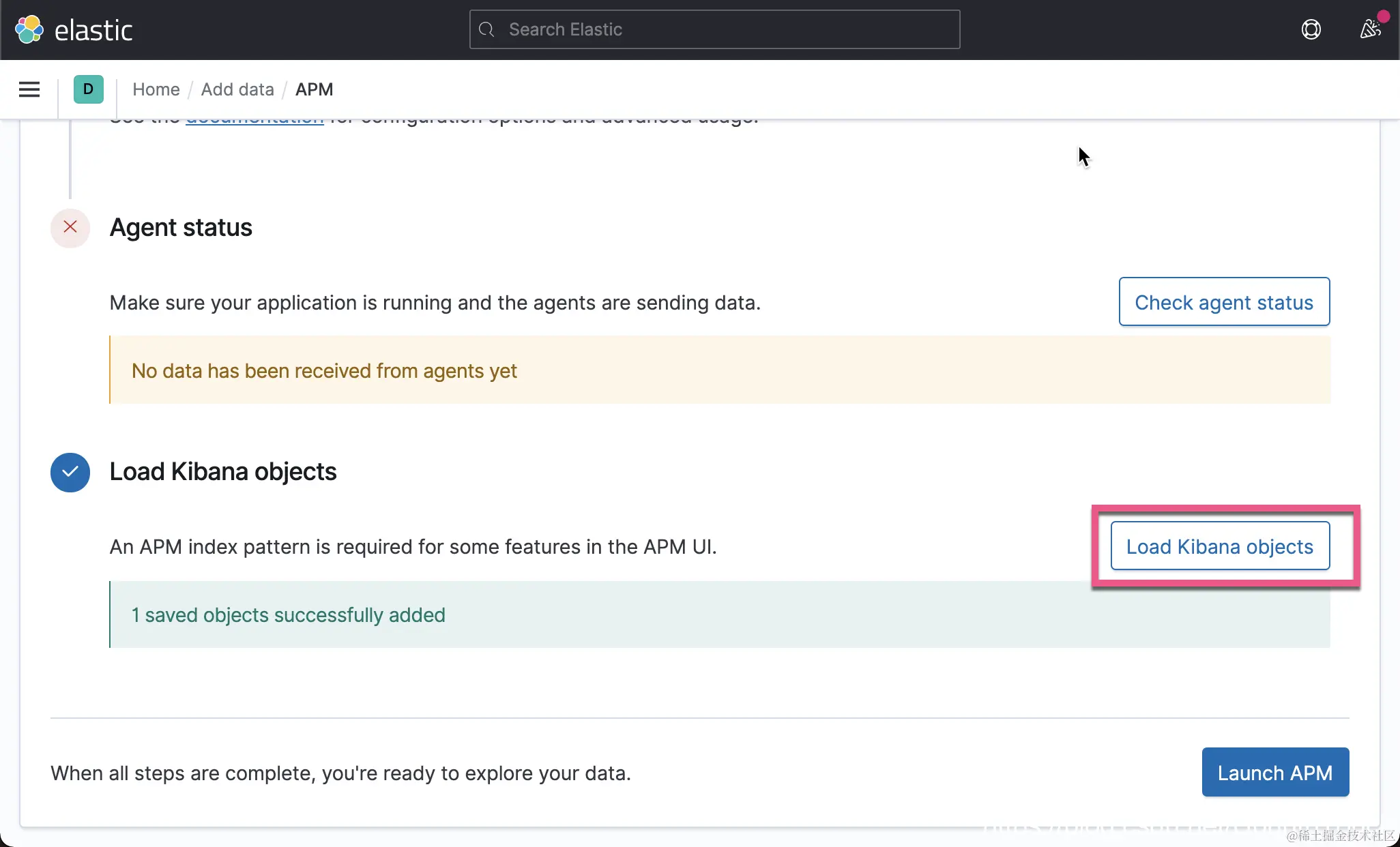 点击上面的 Check APM Server status 按钮。我们可以看到我们已经成功地收到数据了。