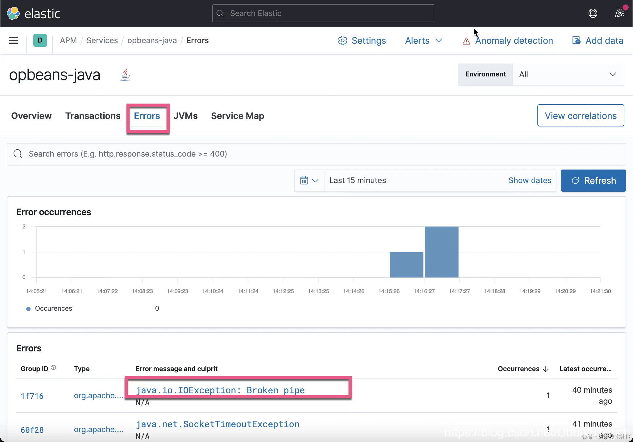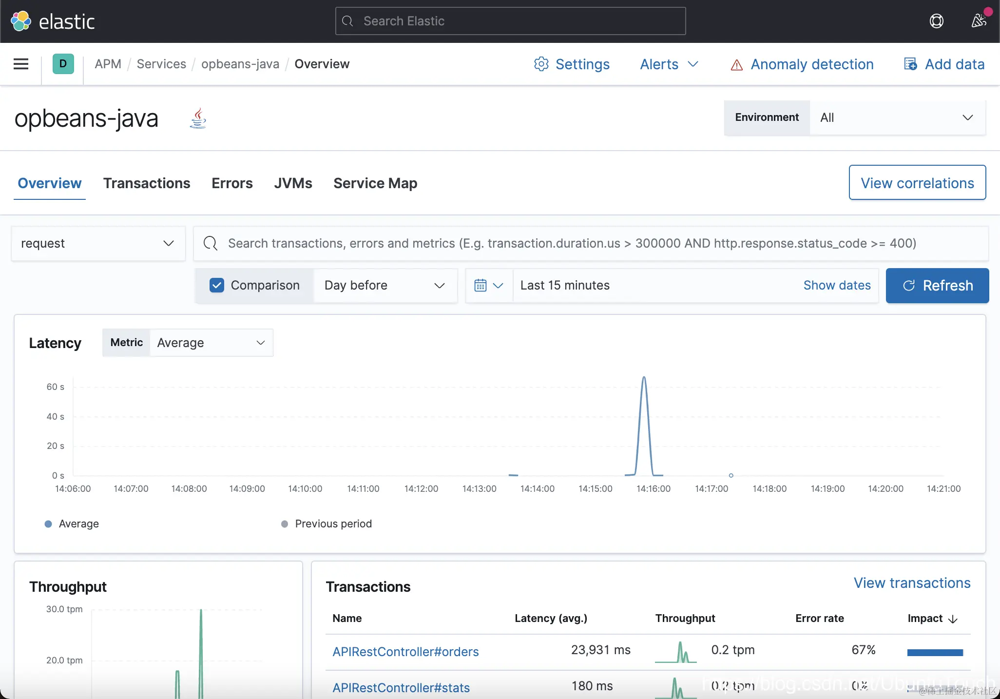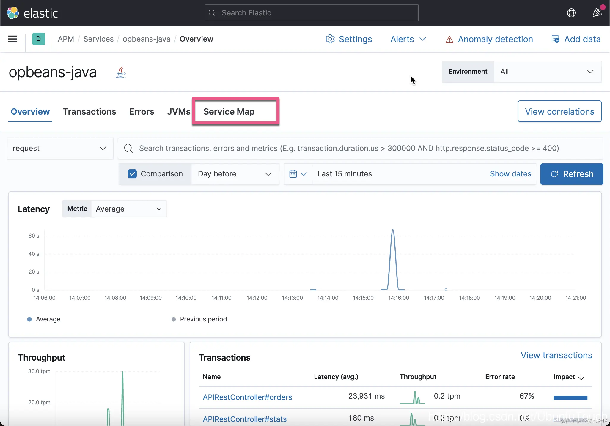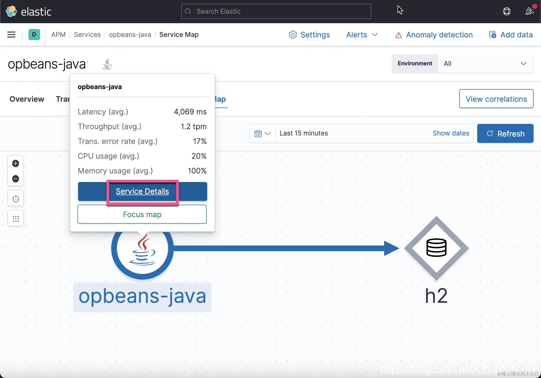 我们可以看到 opbeans-java 访问 h2 数据库。点击上面的 Service Details。它会带我们回到 Service overview 页面: